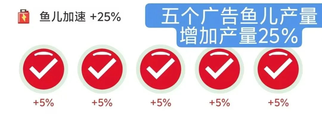 收益加速:领取鱼儿前观看 5 个广告,可解锁 25% 产量加成(单条广告 + 5% 产量),大幅提升鱼儿产出效率