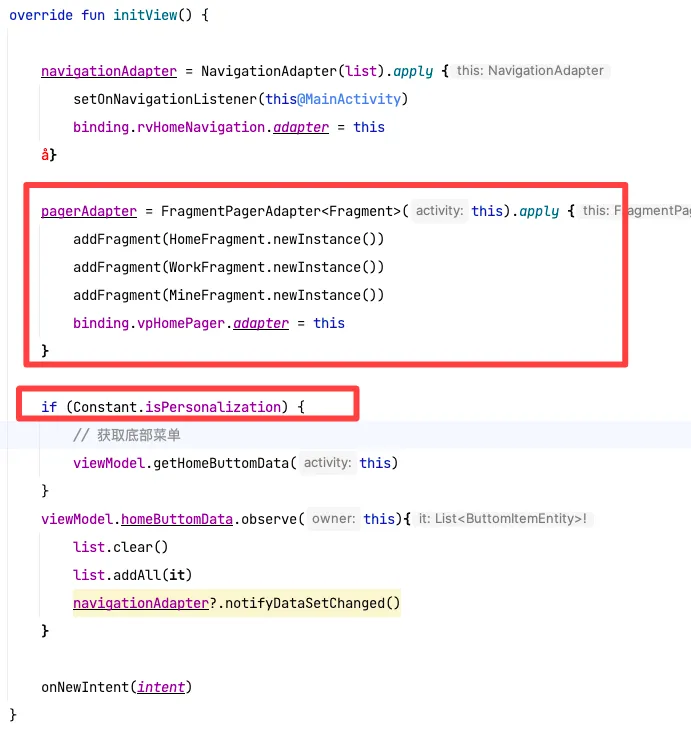 // 初始化ViewPager适配器,绑定3个核心页面FragmentpagerAdapter = FragmentPagerAdapter<Fragment>(this).apply {// 添加首页Fragment(单例创建)addFragment(HomeFragment.newInstance())// 添加工作台Fragment(单例创建)addFragment(WorkFragment.newInstance())// 添加我的Fragment(单例创建)addFragment(MineFragment.newInstance())// 将适配器绑定到ViewPager控件binding.vpHomePager.adapter = this}