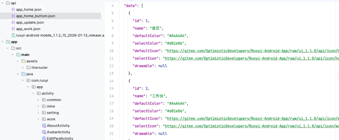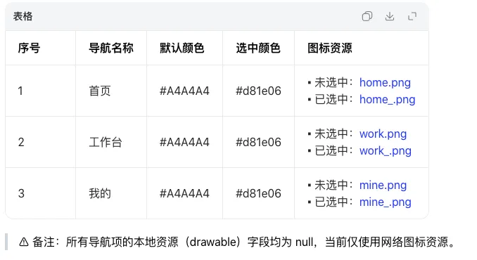 {"code": 200, // 接口状态码:200表示请求成功"msg": "查询成功", // 接口提示信息"data": [ // 导航栏核心配置列表(共3个导航项){"id": 1, // 导航项ID:首页"name": "首页", // 导航项名称"defaultColor": "#A4A4A4", // 未选中时文字/图标颜色"selectColor": "#d81e06", // 选中时文字/图标颜色(红色)"defaultIcon": "https://gitee.com/OptimisticDevelopers/Ruoyi-Android-App/raw/ui_1.1.0/api/icon/home.png", // 未选中图标地址"selectIcon": "https://gitee.com/OptimisticDevelopers/Ruoyi-Android-App/raw/ui_1.1.0/api/icon/home_.png", // 选中图标地址"drawable": null // 本地图标资源(预留字段,暂未使用)},{"id": 2, // 导航项ID:工作台"name": "工作台","defaultColor": "#A4A4A4","selectColor": "#d81e06","defaultIcon": "https://gitee.com/OptimisticDevelopers/Ruoyi-Android-App/raw/ui_1.1.0/api/icon/work.png","selectIcon": "https://gitee.com/OptimisticDevelopers/Ruoyi-Android-App/raw/ui_1.1.0/api/icon/work_.png","drawable": null},{"id": 3, // 导航项ID:我的"name": "我的","defaultColor": "#A4A4A4","selectColor": "#d81e06","defaultIcon": "https://gitee.com/OptimisticDevelopers/Ruoyi-Android-App/raw/ui_1.1.0/api/icon/mine.png","selectIcon": "https://gitee.com/OptimisticDevelopers/Ruoyi-Android-App/raw/ui_1.1.0/api/icon/mine_.png","drawable": null}]}
