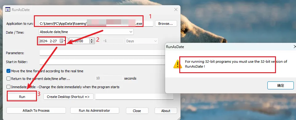 我这里是提示我选择的程序是32位的,让我用32位的RunAsDate版本,那我们就换一个:
