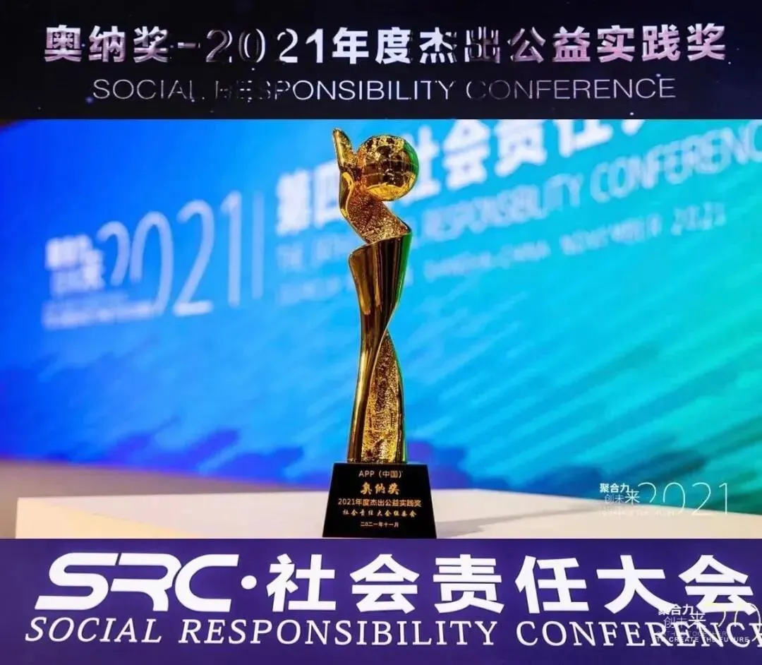 11月29日,2021(第四届)社会责任大会圆满举办。APP(中国)荣获“奥纳奖-2021年度杰出公益实践奖”。这是对金光集团APP根植中国近30年来积极履行企业社会责任,包括在绿色实践与可持续发展、精准扶贫、公益慈善等方面所做努力的肯定。