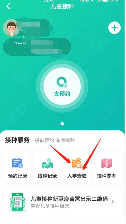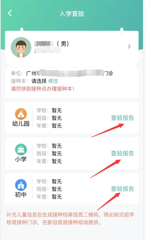 5.绑定儿童信息→点击入学查验→查验报告→下载PDF文件/保存至相册→打印。