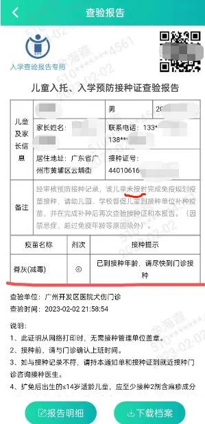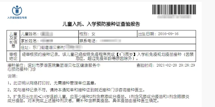 系统会自动生成《儿童入托、入学预防接种证查验报告》(简称「查验证明」)。
