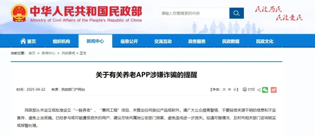 关于有关养老APP涉嫌诈骗的提醒 民政部从未设立或批准设立“一脉养老”、“惠民工程”项目,未推出任何类似产品或软件。请广大公众提高警惕,不要轻信来源不明的信息和不实宣传,避免上当受骗。已经参与或可能遭受损失的用户,建议尽快向属地公安部门报案,避免造成进一步损失。如遇可疑情况,及时向相关部门咨询核实或报警处理。 来源:中华人民共和国民政部官网