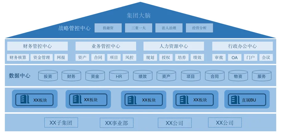 基于集团总部职能,围绕强化“智慧企业”,打造集团管控六大中心(战略管控中心、财务管控中心、业务运营中心、人力资源中心、行政办公中心、数据中心),推动国企数字化转型,实现集团总部对产业公司的全方位智慧监督、全要素智慧管理和全领域智慧支撑。