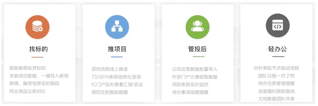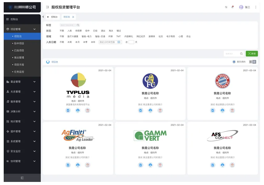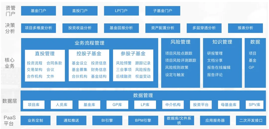 以投资人、基金、项目为管理主线,覆盖投资公司资金募集、项目投资、投后管理、项目退出全业务链条。采用数据和流程相结合的方式将LP、渠道、管理公司、基金运营管理、项目投资经理、合伙人连接起来,使各个类别的项目都按照风险最小的流程运行,提高项目投资的效率、屏蔽投资风险。