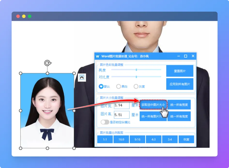 一、我们下载后得到一个很小巧的单文件软件,双击打开,让其在Word文档上方。接着选中小图(即调整的目标状态),点击“获取选中图片大小”,此时图片宽高则会显示对应的数值。