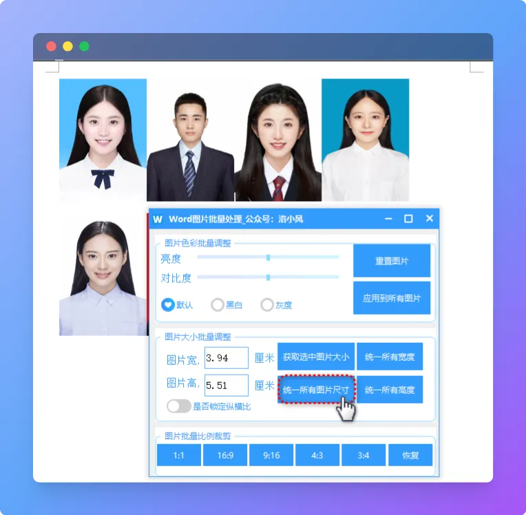 导入Word文档中的图片很难全部选中,如果想批量调整图片尺寸等,很难做到。如我导入了多张证件照,想把它调整为那张小图的形式,除了费时费力地一张张地调整,还有什么方法呢?