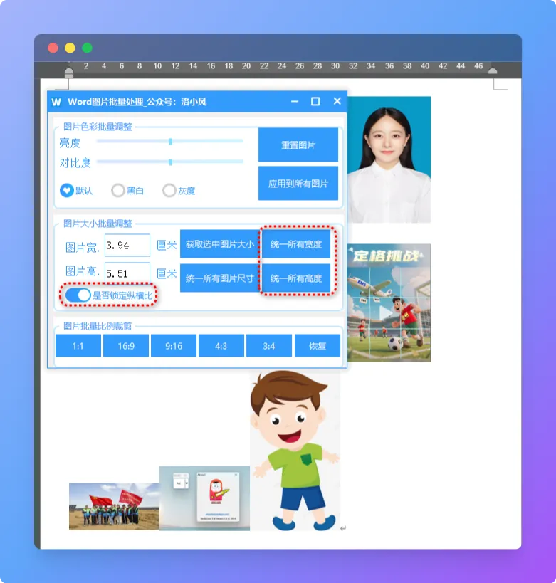 三、如果是图片有横版和竖版的,此时可以打开“是否锁定纵横比”,然后根据需要点击“统一所有宽度”或者“统一所有高度”,保证图片不至于比例失调。