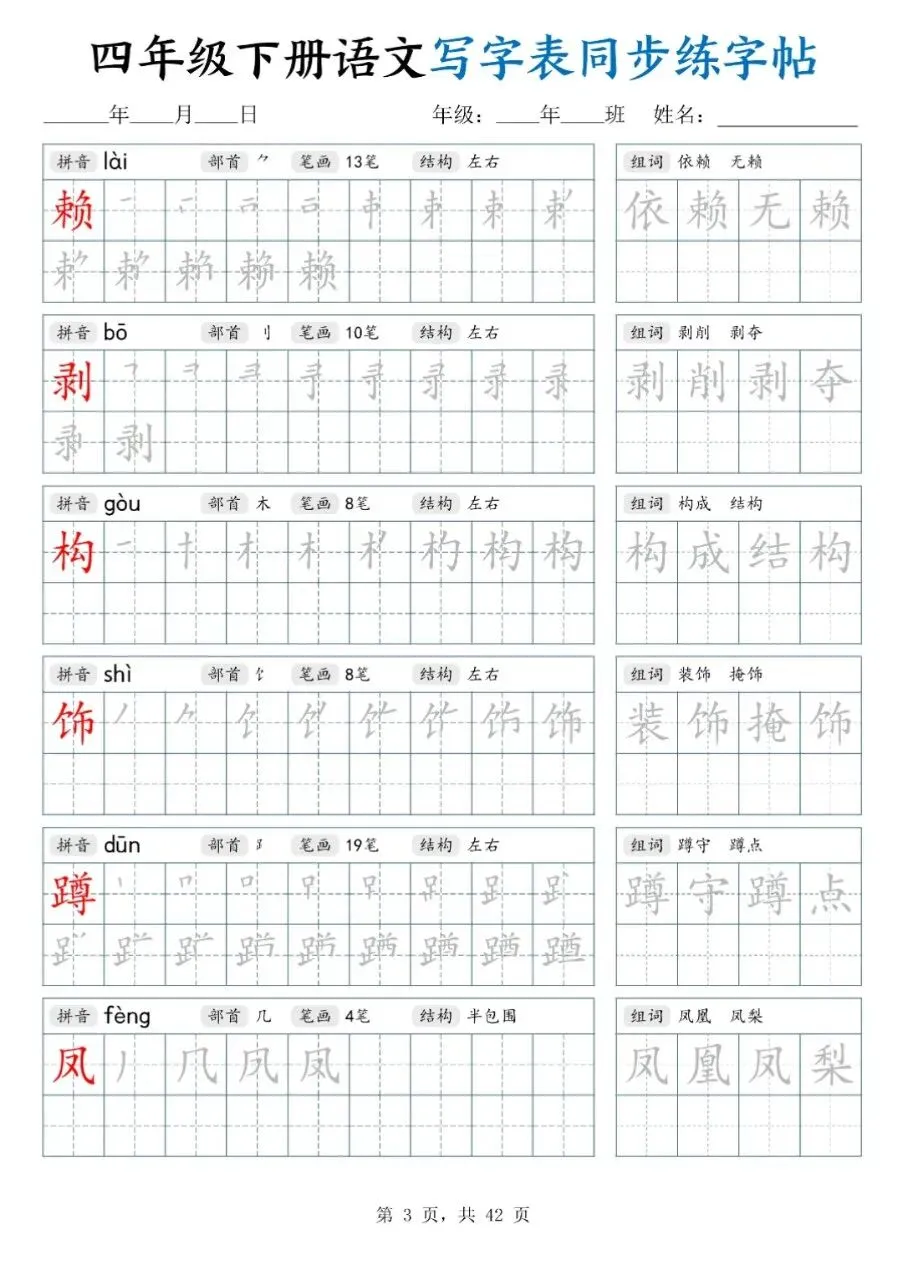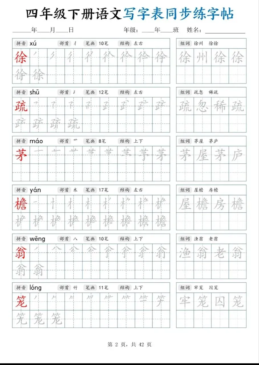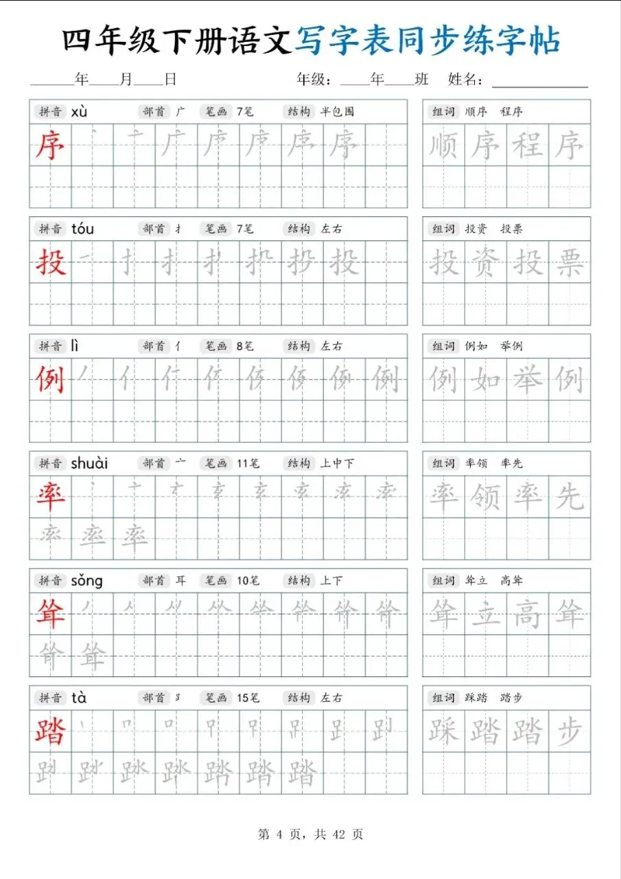 四年级下册同步生字描红字帖|42页高清电子版,同步课本练字超省心!