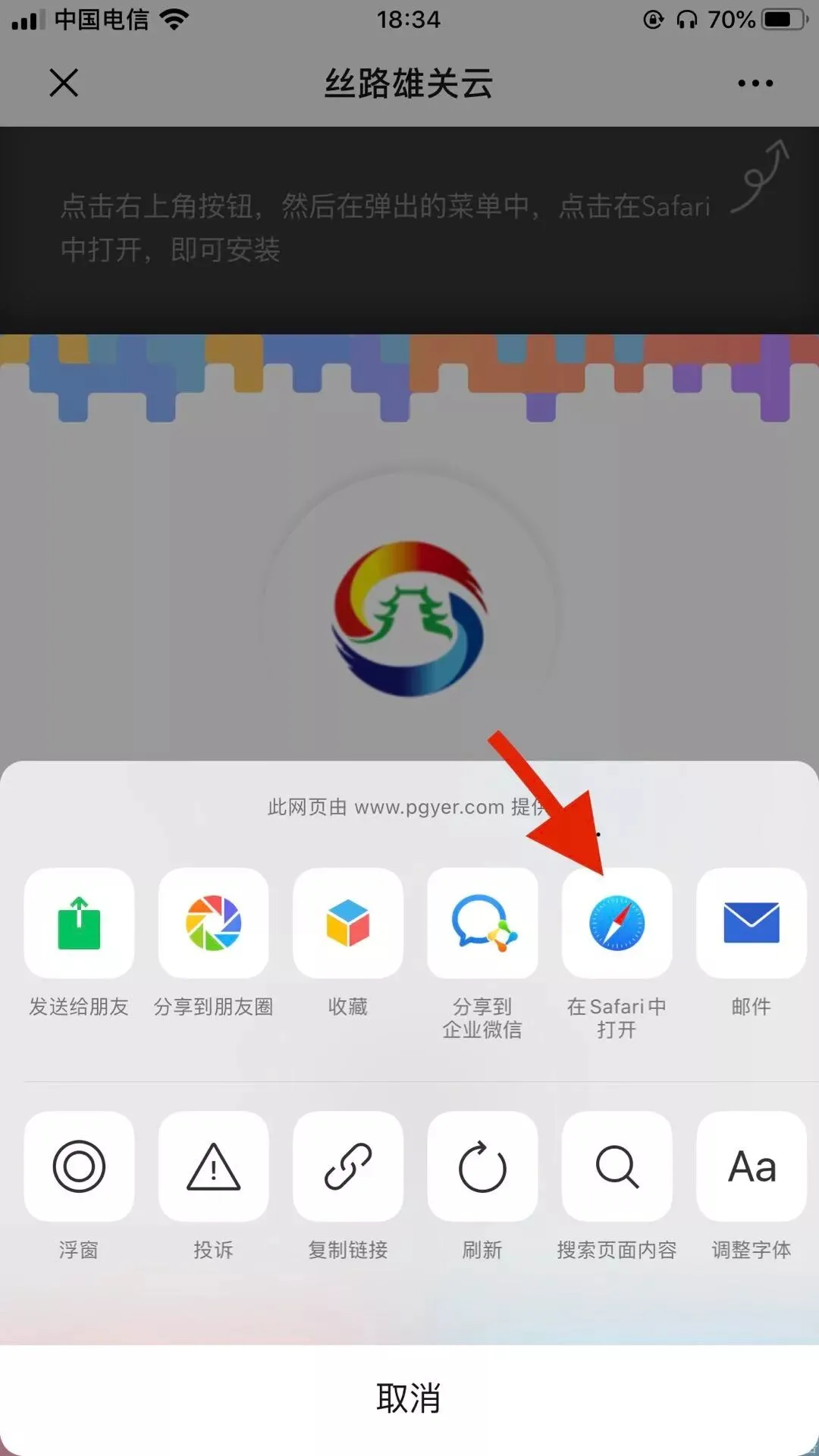 4.在弹出的菜单中点击“在Safari中打开”按钮