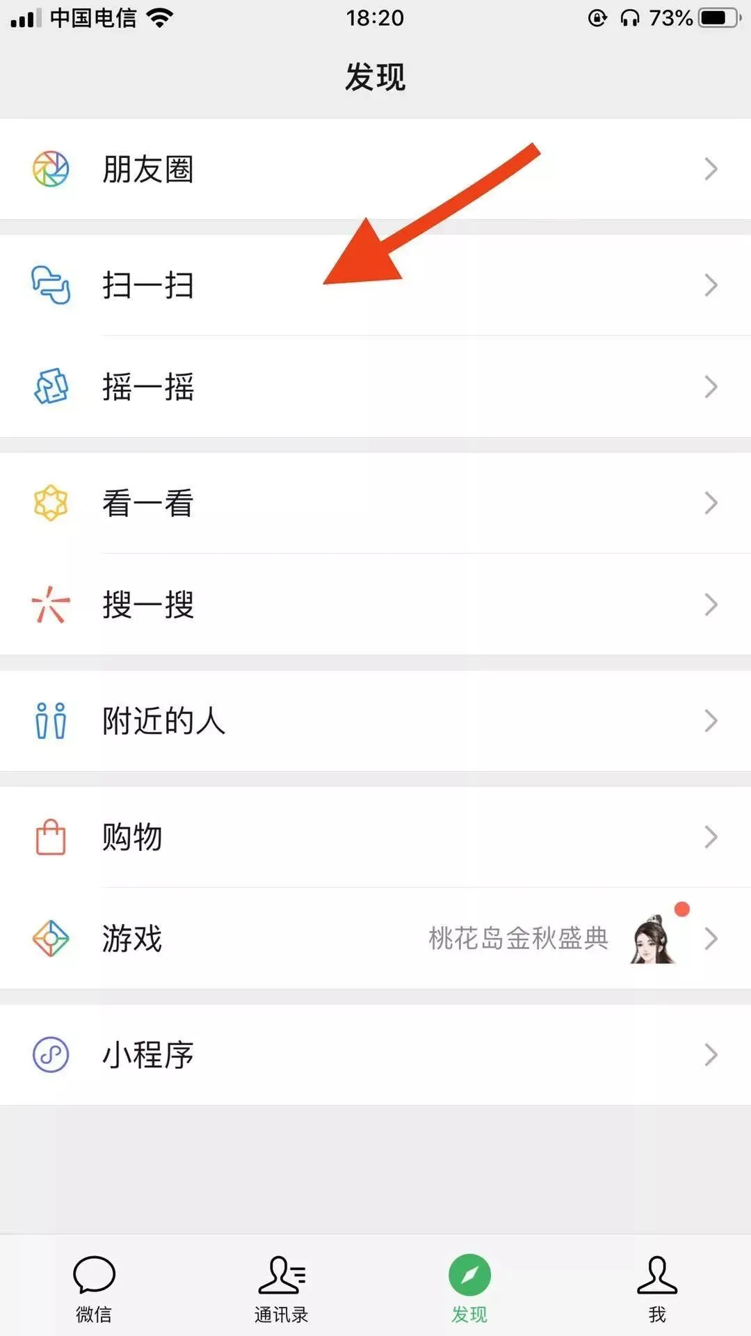 1.打开微信APP,点击“发现”模块,点击“扫一扫”按钮
