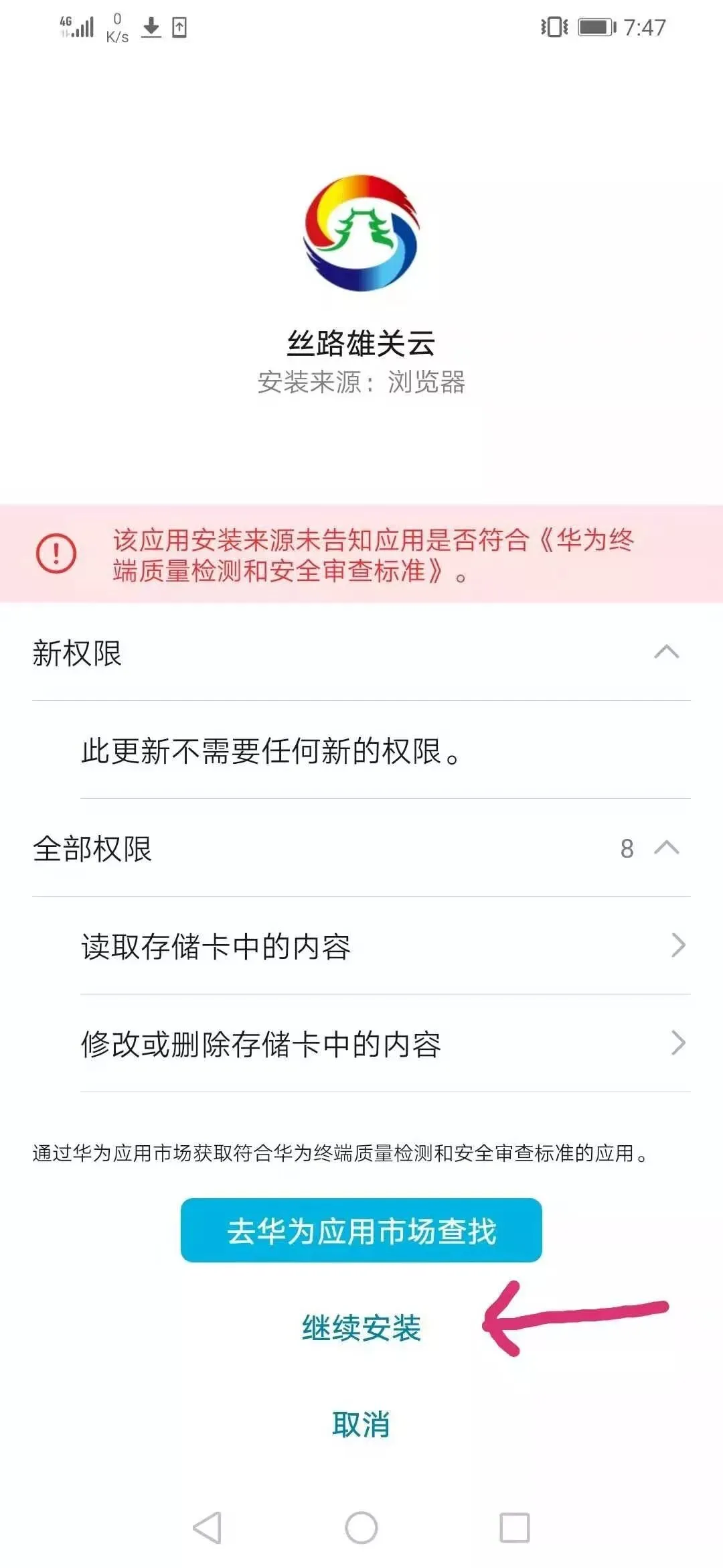 9.如果是华为手机,会弹出如下图页面,点击“继续安装”按钮完成安装