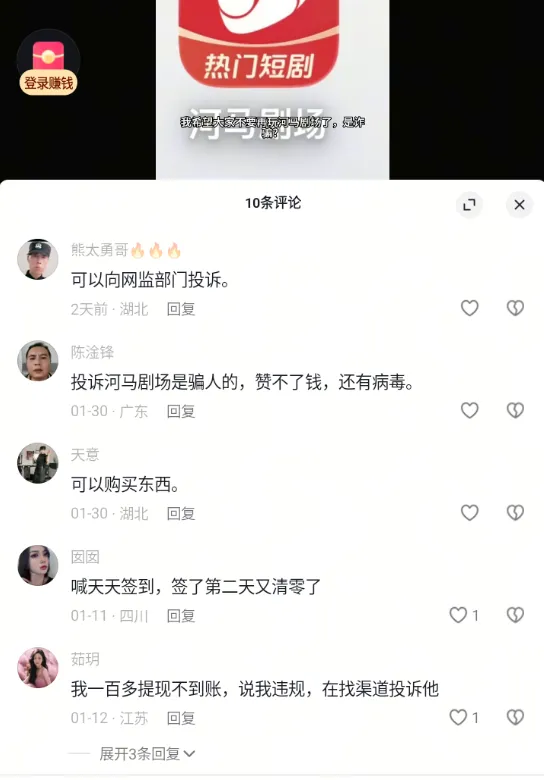 避坑提醒:不要下载或使用河马剧场及同类“赚钱领金币”APP,尤其警惕“手抖自动下载”的风险;