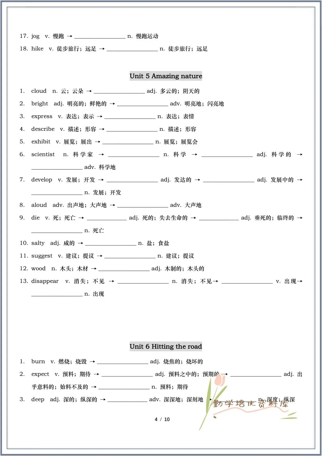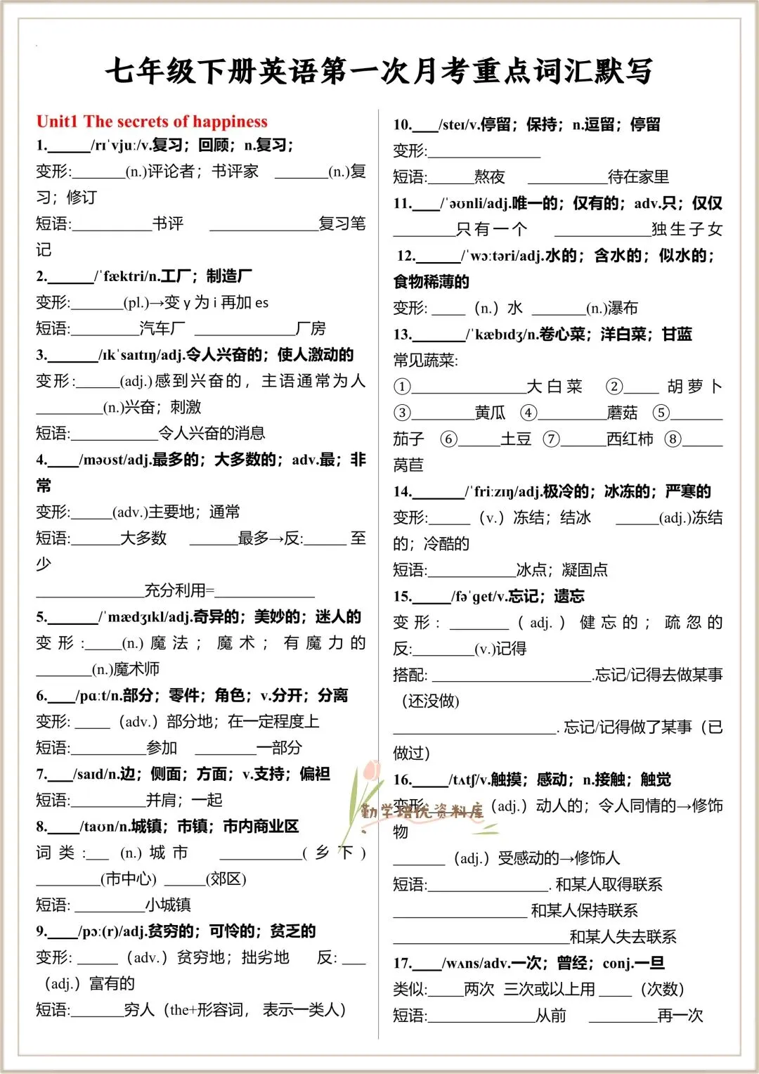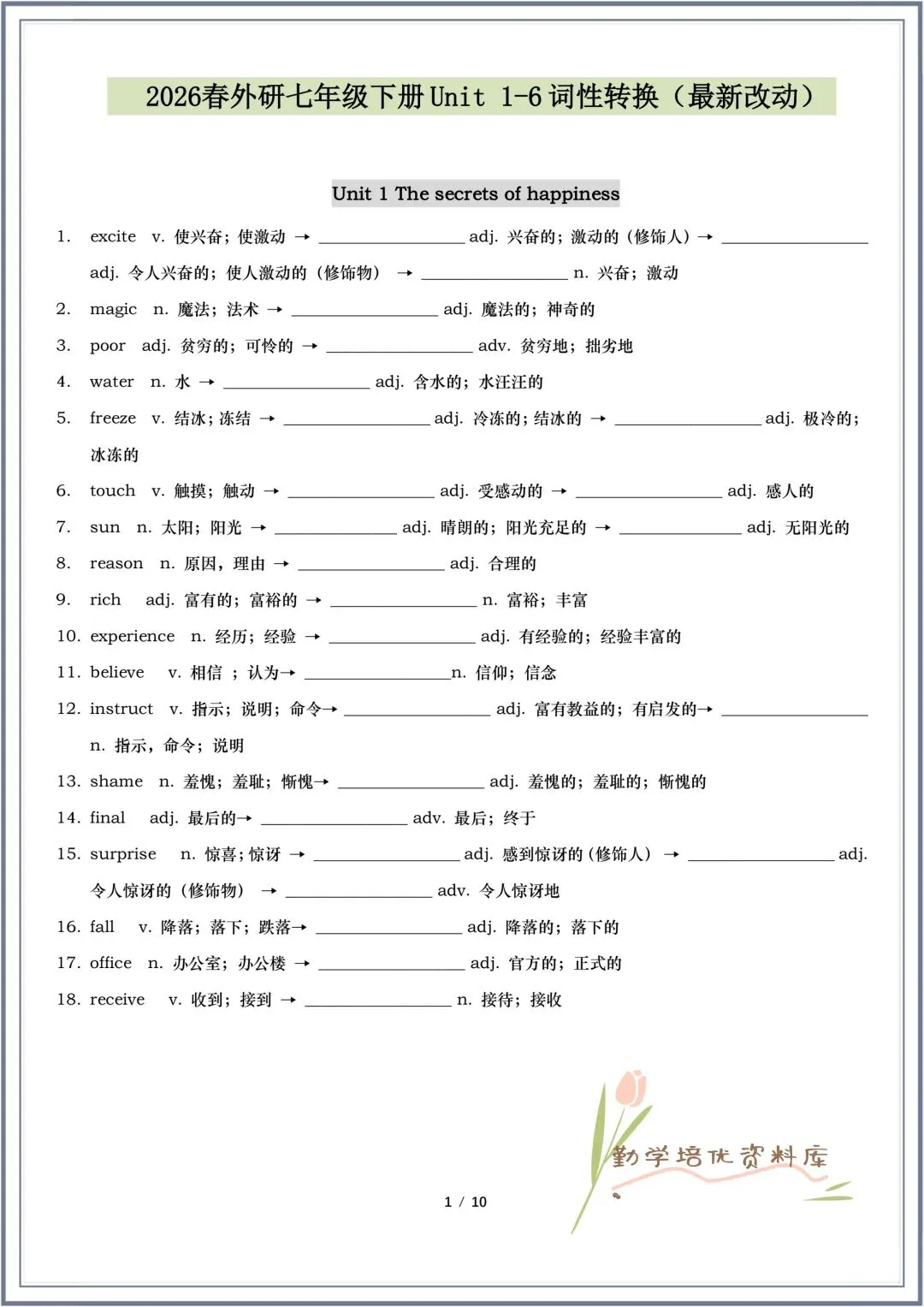 今日老师精心给大家整理了:2026春(外研版)七年级下册英语Unit1-Unit6词性转换(最新改动)+第一次月考重点词汇默写,有高清电子版可打印!