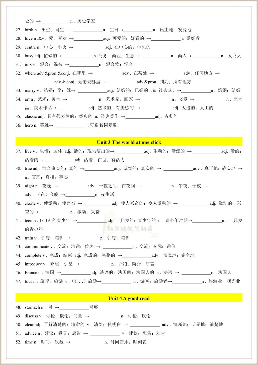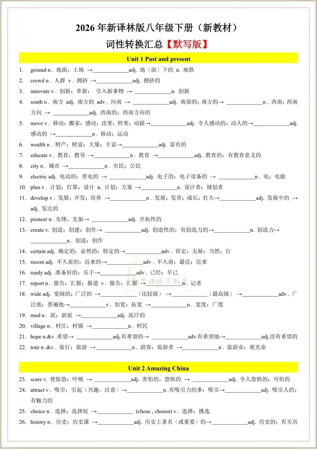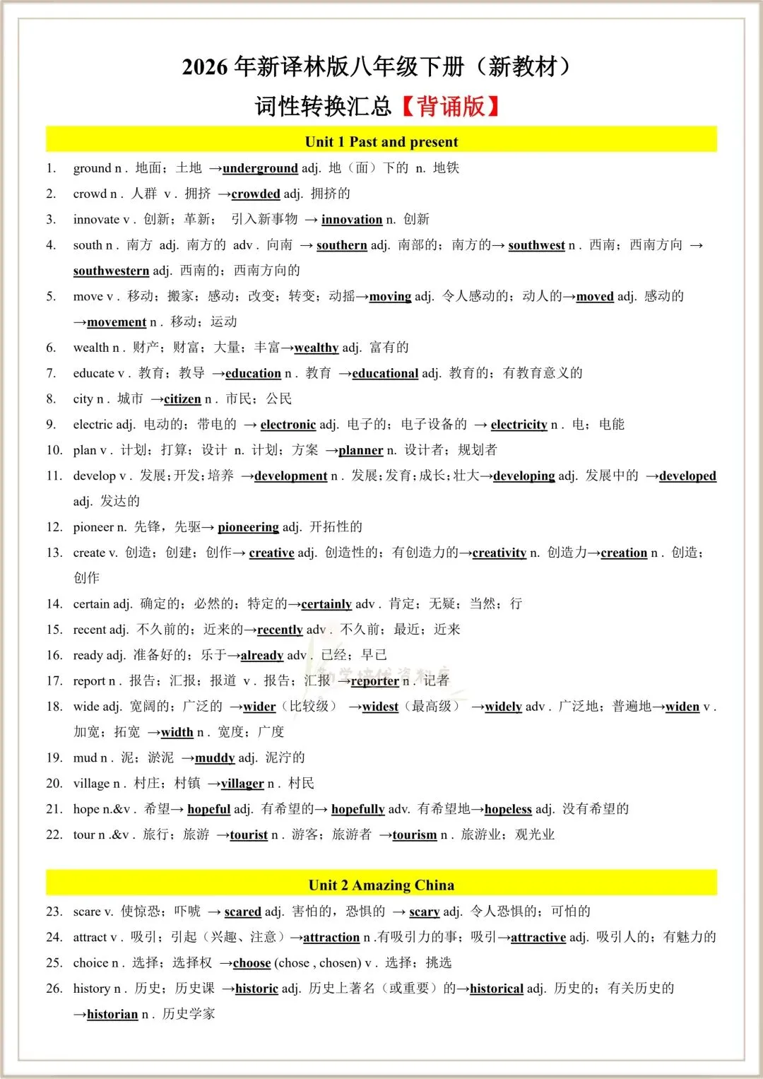 今日老师精心给大家整理了:2026春(译林版)八年级下册英语词性转换汇总+单元核心知识点汇总(词汇+短语+句型+语法),背诵版+默写版,电子版可下载打印!