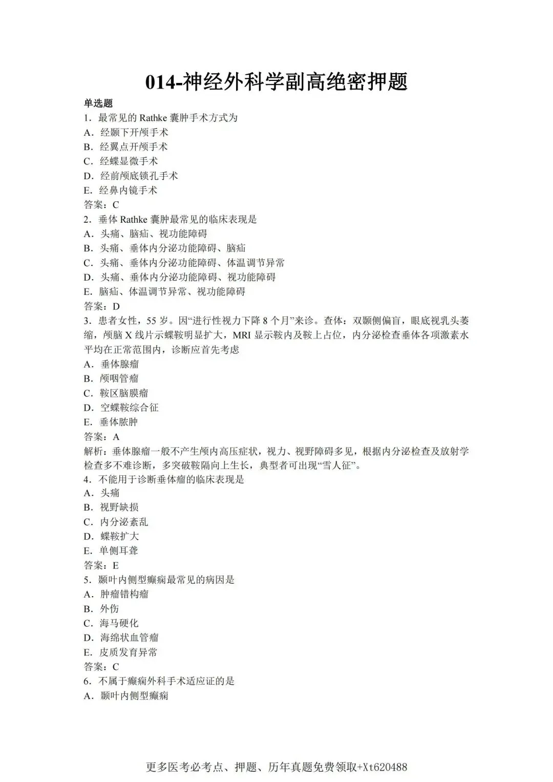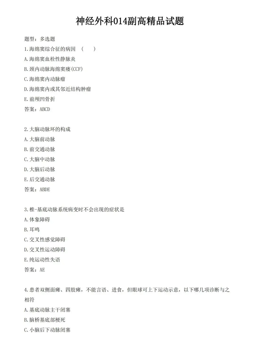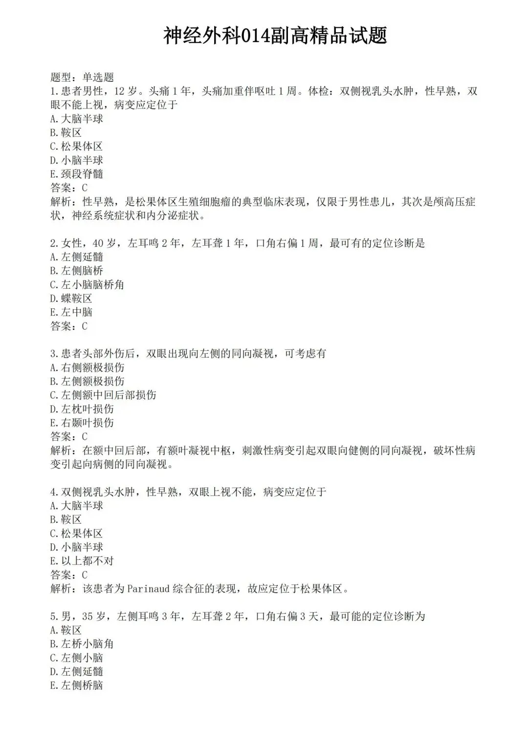 五、神经外科学高级职称014历年真题【历年真题—真题是对考试考点、难度的真实反映,先过一遍历年真题,了解考情和考点,卫生职称往往会存在历年真题重现,考生重点把握】