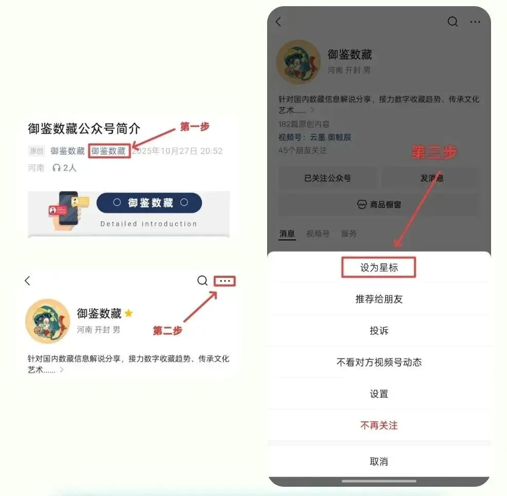 因为推送机制的变革,现在没有星标的账号,很容易被错过推送,为第一时间接收活动公告,所以一定别忘记🌟星标🌟“御鉴数藏”! 流程如下:↓