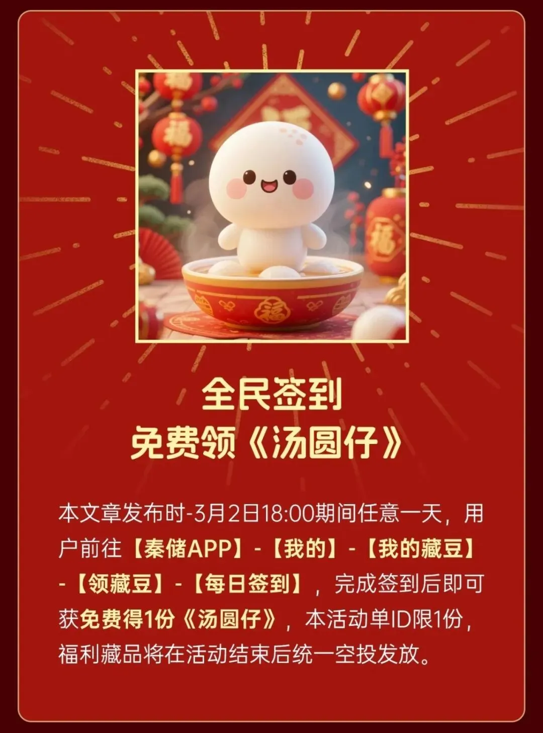 秦储APP推出元宵专属福利活动,用户在官方文章发布当日至3月2日18:00期间,任意一天前往【秦储APP】-【我的】-【我的藏豆】-【领藏豆】-【每日签到】完成签到,即可免费获得1份《汤圆仔》数字藏品。活动单ID限领1份,福利藏品将在活动结束后统一空投发放。《汤圆仔》以可爱的汤圆形象为设计核心,契合元宵佳节氛围,兼具纪念意义与收藏价值。此次活动旨在回馈用户,通过数字藏品传递节日祝福,同时推动数字藏品生态的普及与发展,让更多用户感受数字文化的魅力。