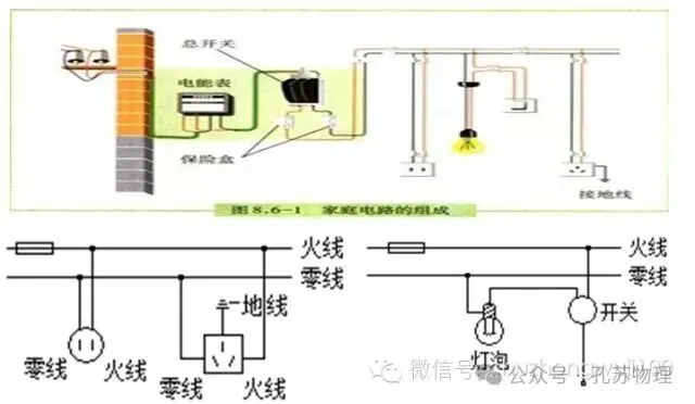 113.家庭电路的组成:家庭电路由进户线、电能表、闸刀开关、保险丝、开关、用电器、插座、导线等组成。