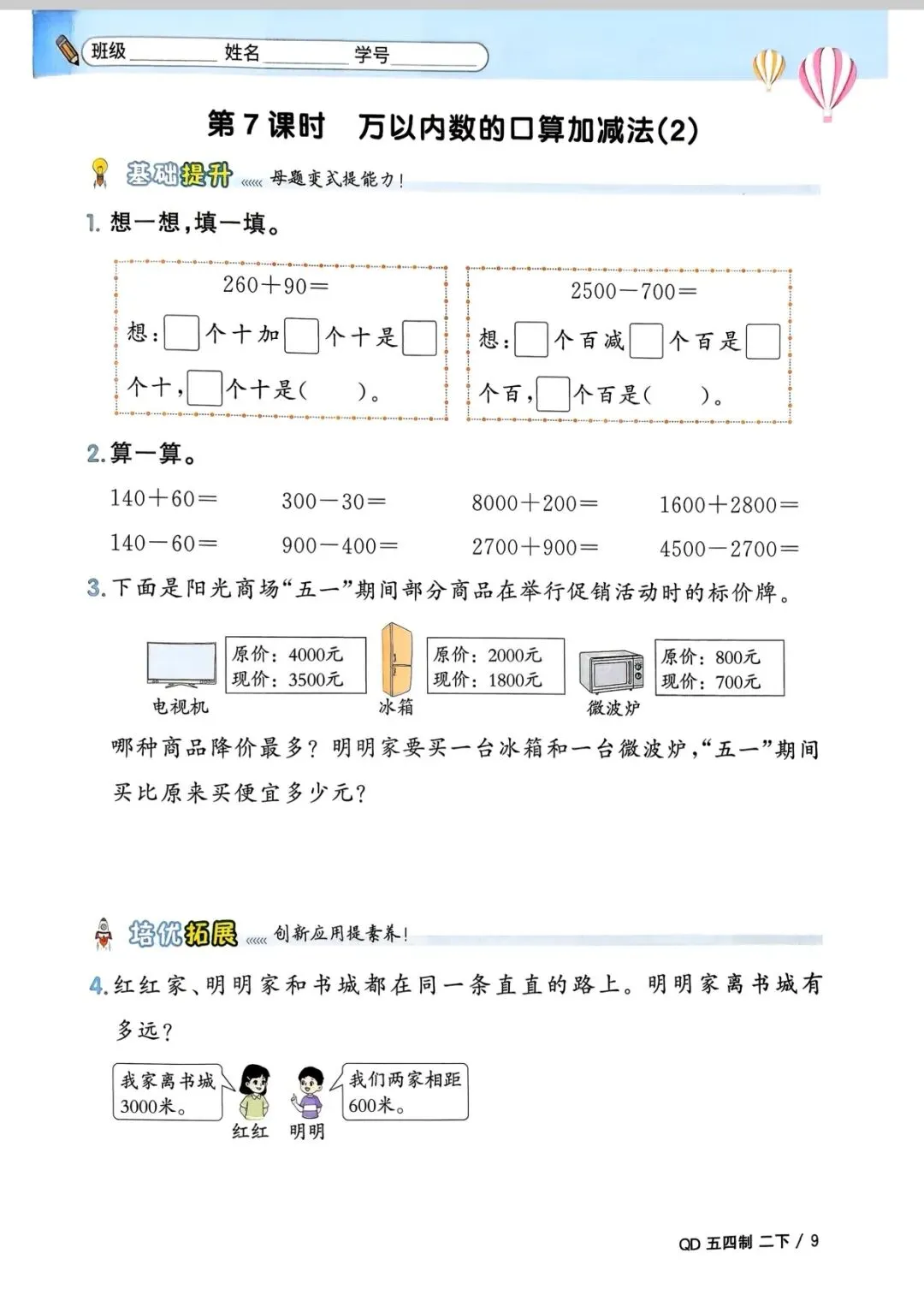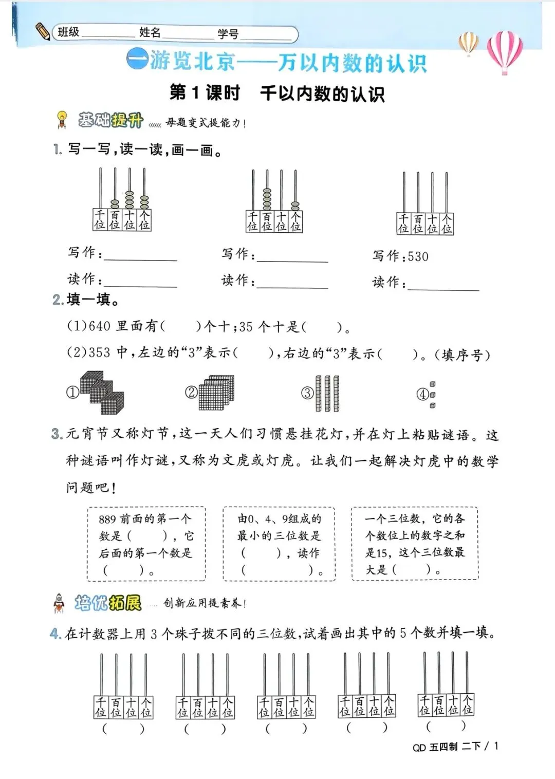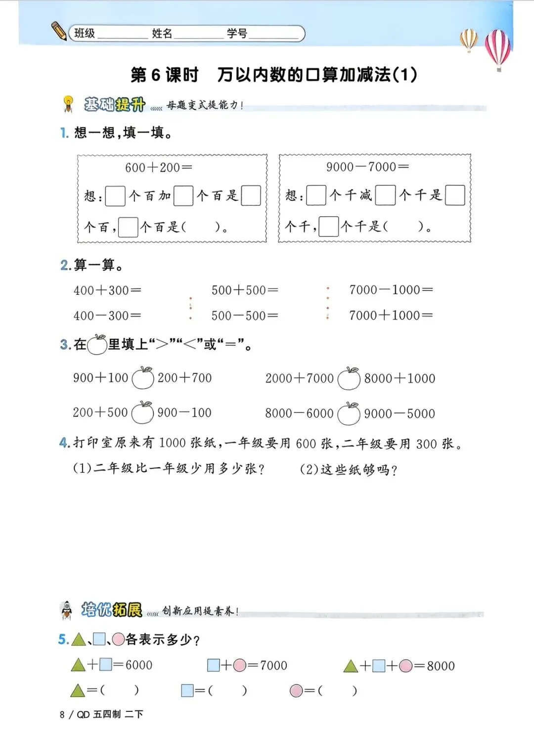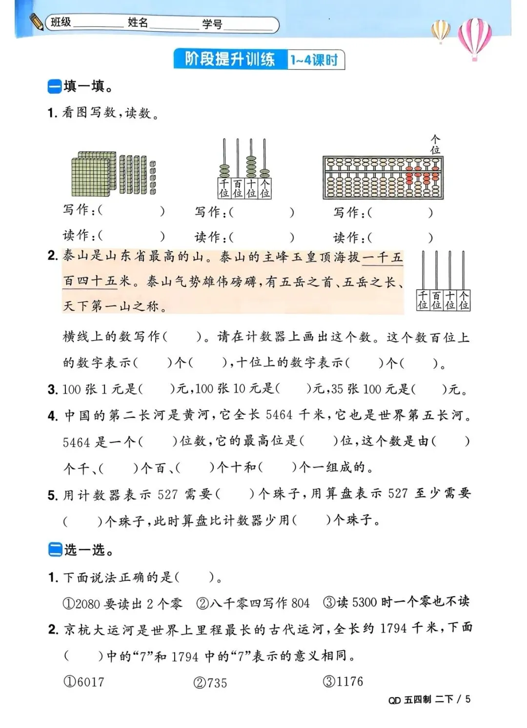 二年级下册数学(电子版可打印附答案)
