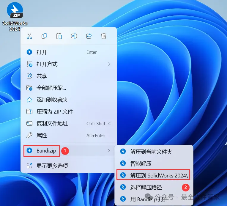 1、下载SolidWorks 2024软件安装包到电脑上,右键选择【解压到SolidWorks 2024\】