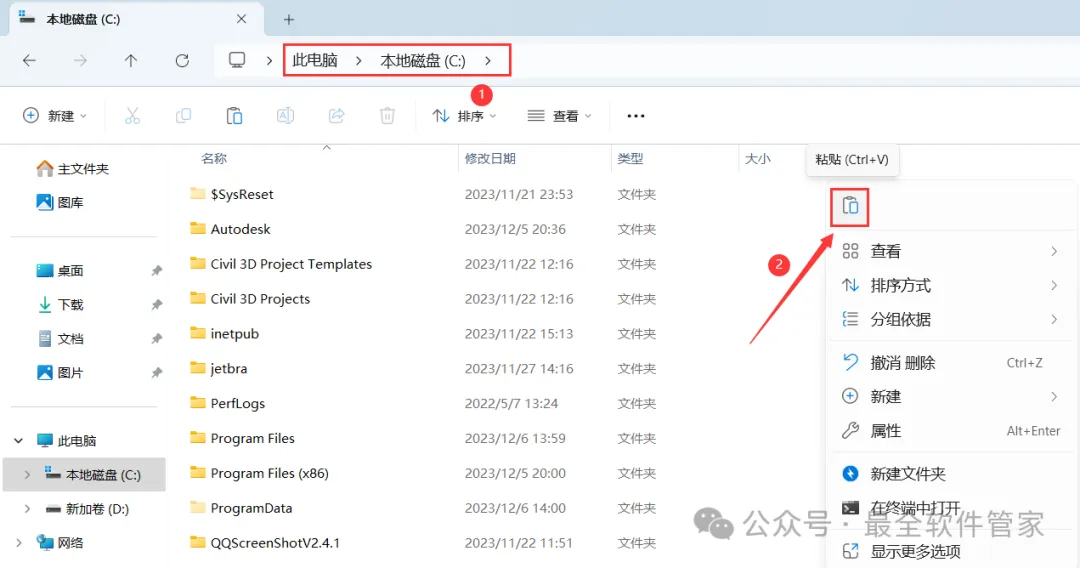 27、打开路径:D:\Program Files,右键文件夹的空白处,点击【粘贴按钮】