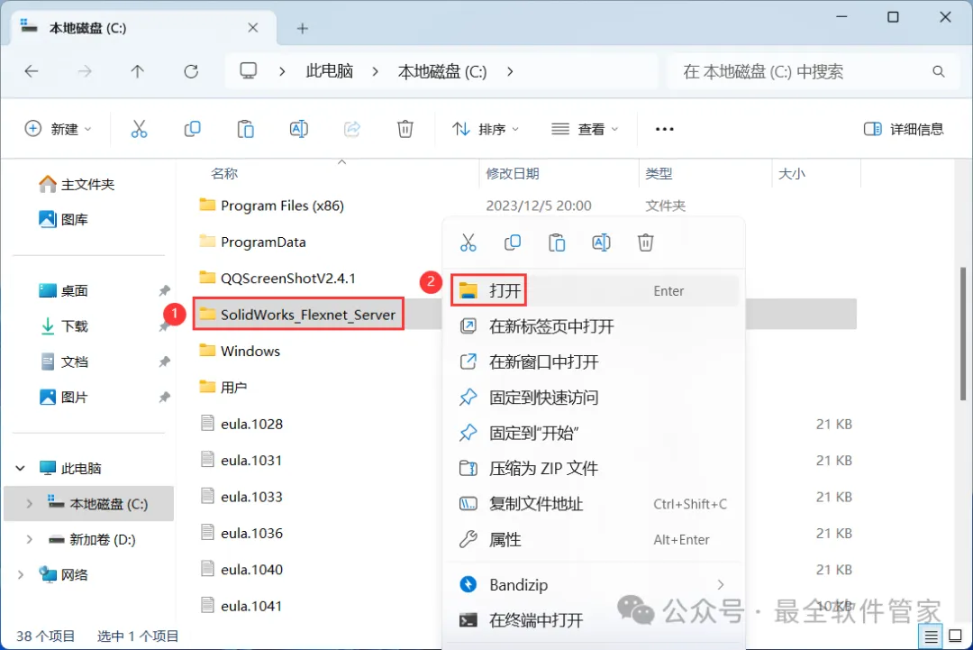 9、找到粘贴的【SolidWorks_Flexnet_Server】文件夹,右键【打开】它