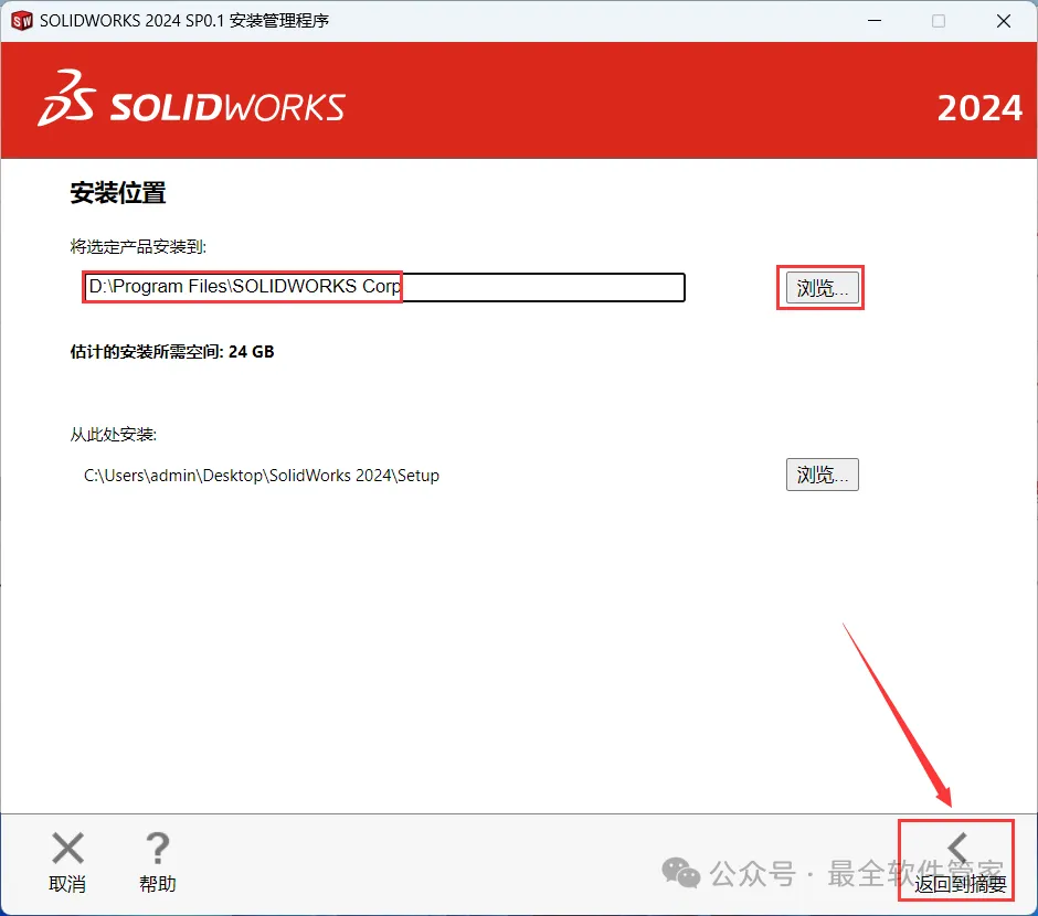 20、软件默认安装在C盘,可自定义更改软件安装位置,这里小编选择安装在D盘;点击【返回到摘要】