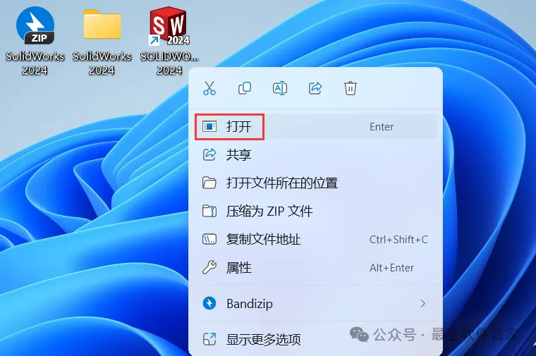 32、回到桌面,右键桌面上的【SolidWorks 2024软件图标】,点击【打开】