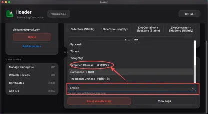 3. 打开 iLoader 后,先把语言设置成「简体中文」(操作更顺手,避免英文看不懂);