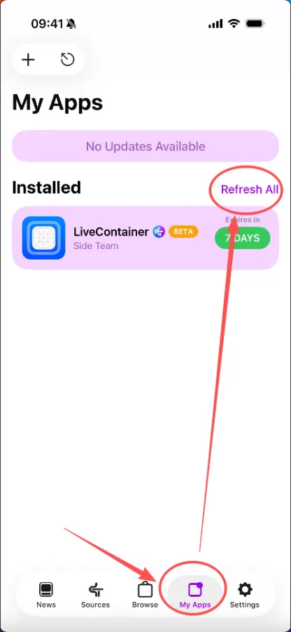 1. 打开 SideStore,点击底部「My Apps」-「Refresh All」,输入你的 Apple ID 和密码;