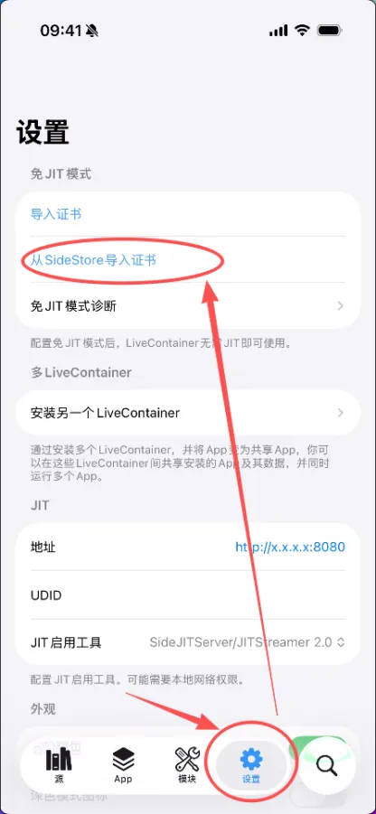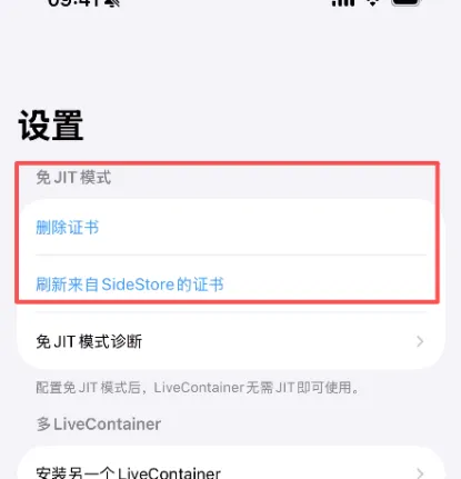 5. 关闭 LiveContainer 进程,重新进入 LiveContainer 界面,点击「设置」-「从 SideStore 导入证书」,导入成功即完成准备。