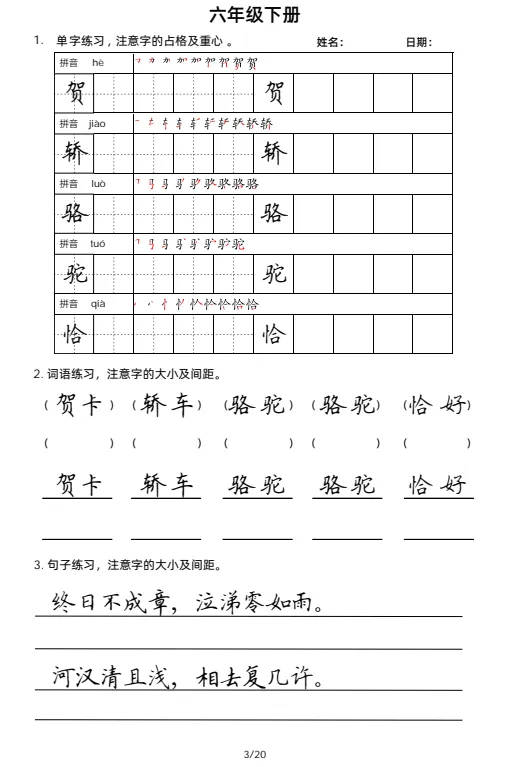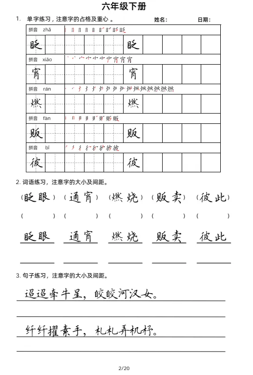 大家好,今天欣妈给大家分享的是:2026年春六年级下册语文《字词句每日小练笔》字帖,有生字练习,词语练习,句子练习;一二三四五六年级同款,电子版可下载可打印,拉至文末左下角,阅读原文处,完整电子版文章末尾可直接领取,无套路,欢迎收藏和下载。如果觉得这份资料不错,建议分享到班级群/年级群,让其他家长打印出来,帮助孩子学习;如果觉得合适,请支持正版!