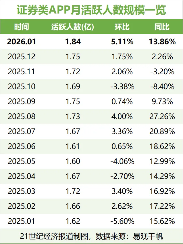 易观千帆最新数据显示,2026年1月,证券类APP活跃用户数(简称“月活”)达1.84亿,高于2025年全年所有月份,同比增长13.86%,环比增长5.11%。