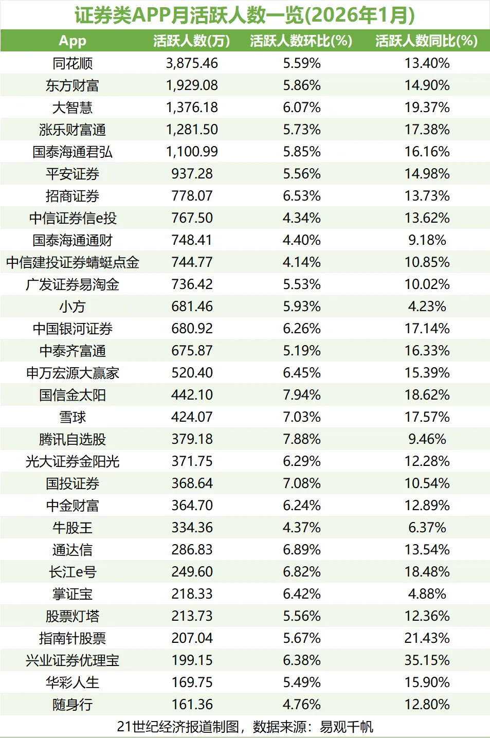 易观千帆证券行业咨询专家杨玲表示,2026年1月证券APP活跃用户数的显著增长,主要受到春季行情的驱动,市场赚钱效应有效催化了投资者的开户与交易需求。