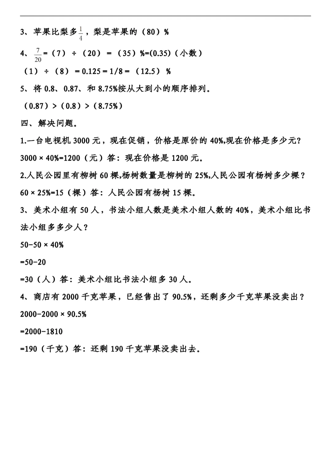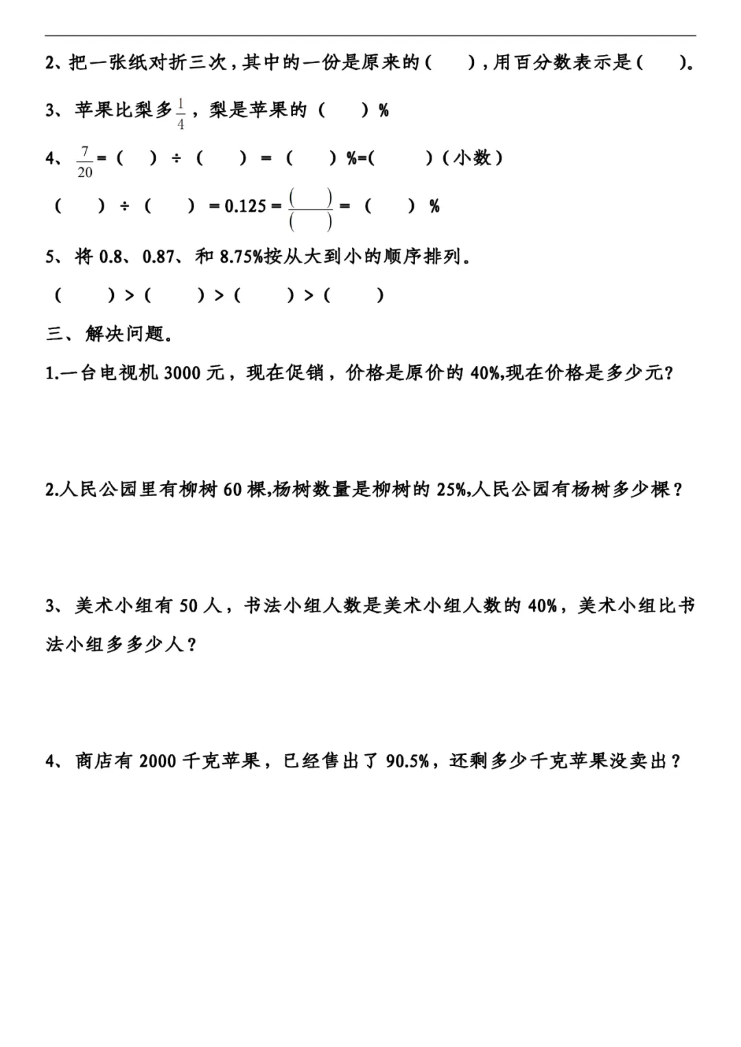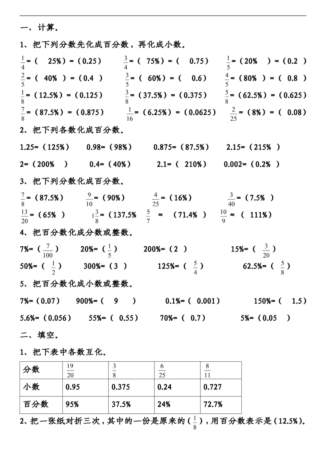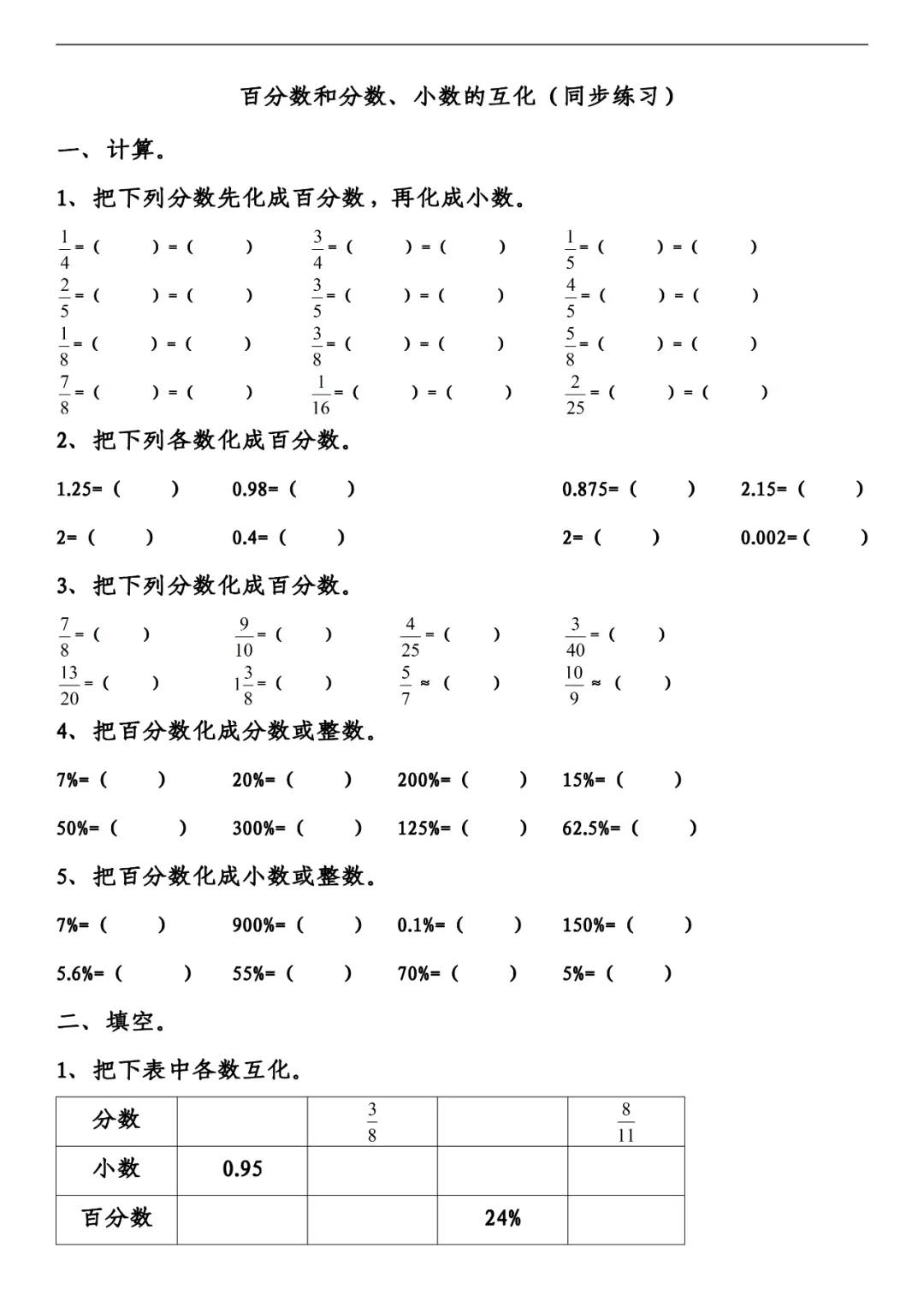 六年级下册数学百分数、小数、分数练习,可打印!