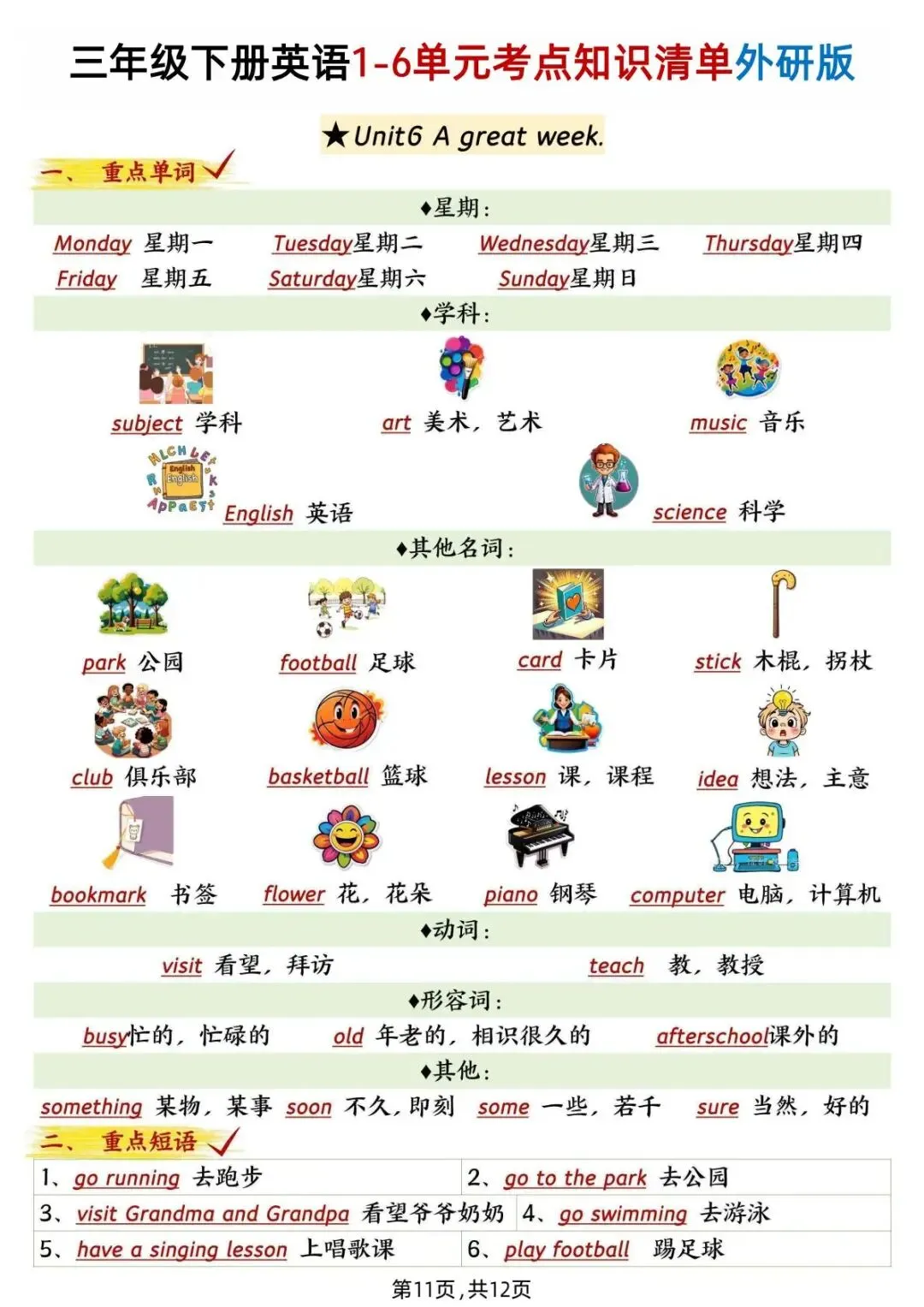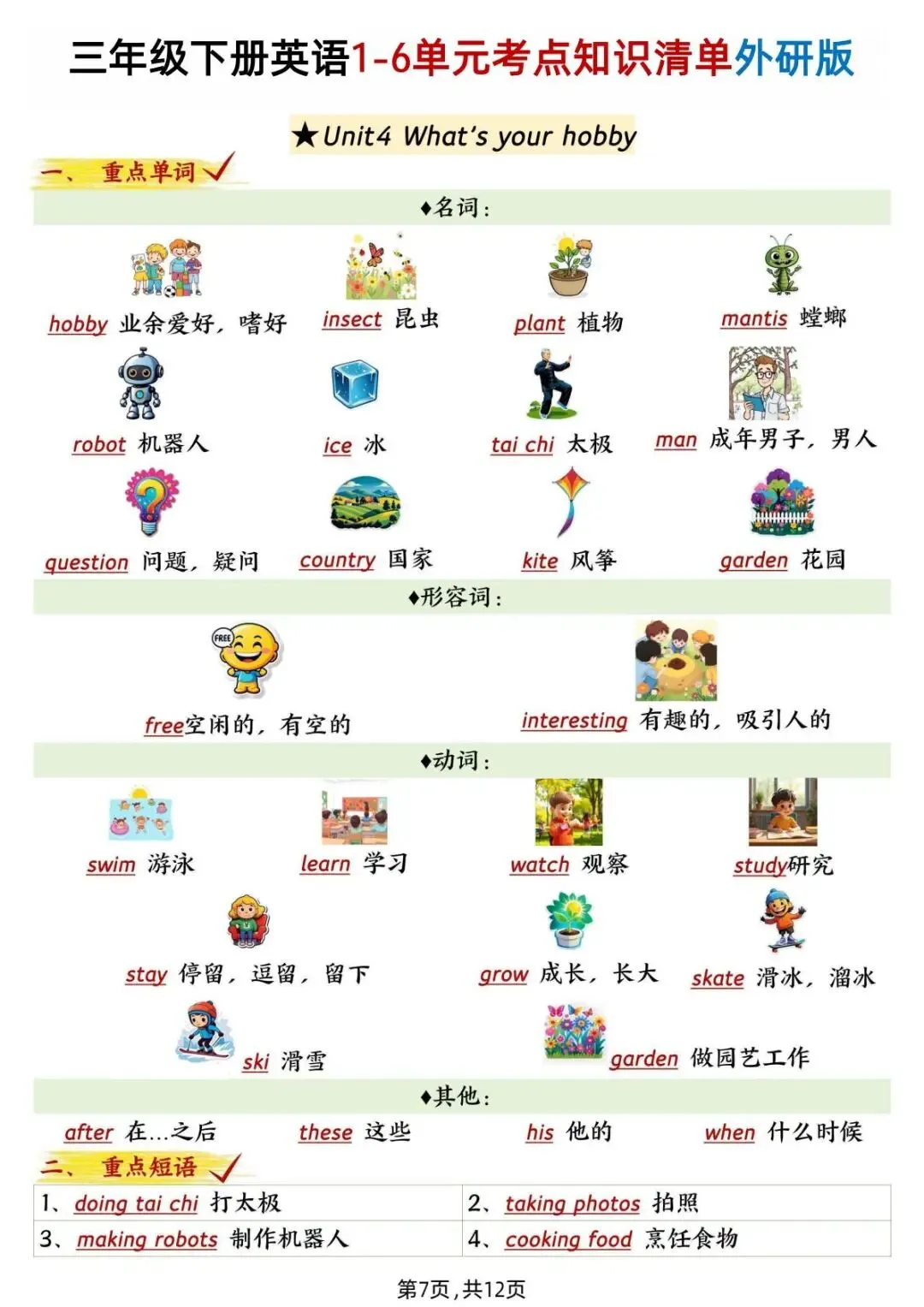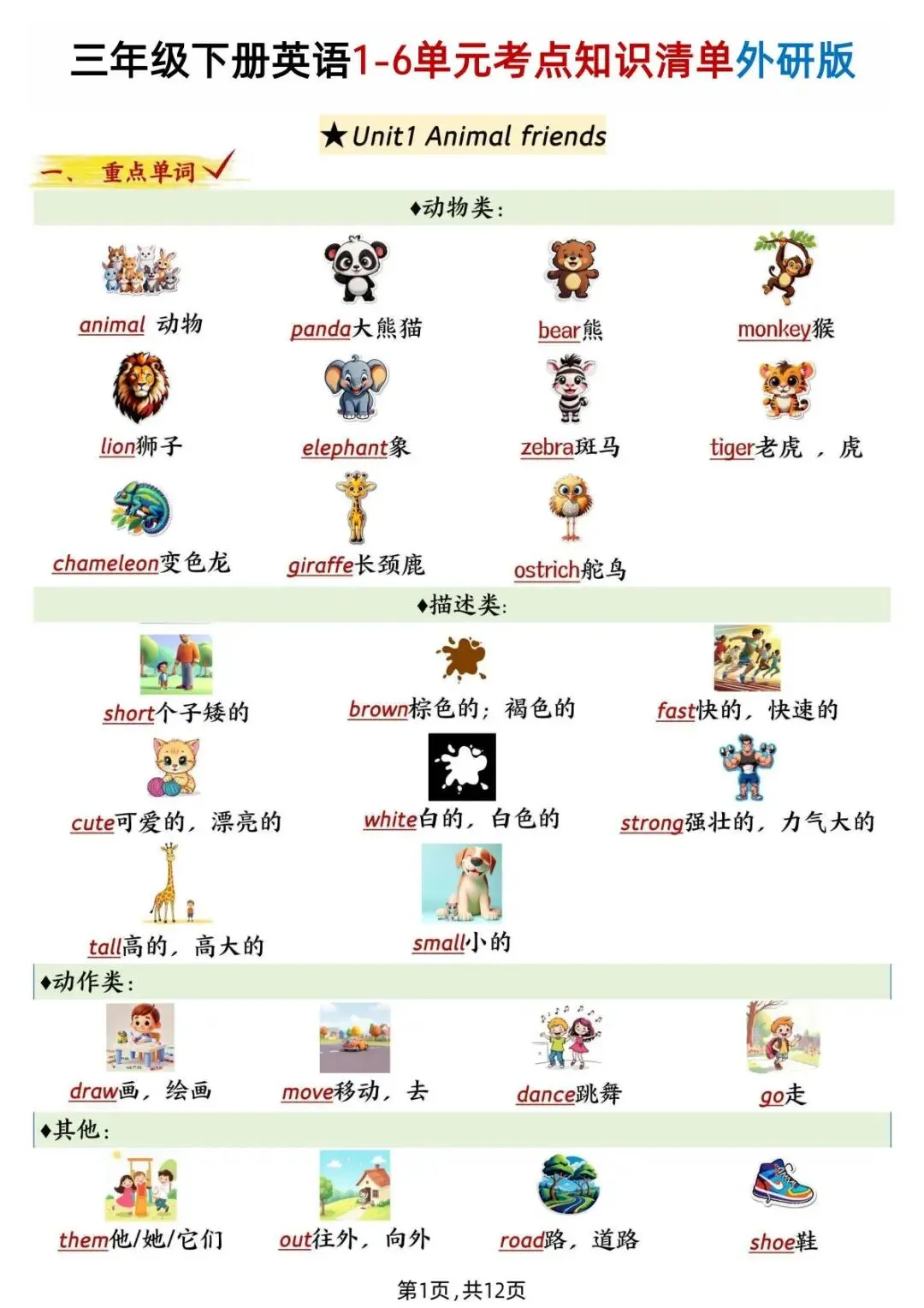 三年级下册英语1-6单元考点知识清单外研版,完整版12页,电子版可打印!按单元整理,重点单词、短语、句型全覆盖,还配了可爱插图帮娃记忆,完全贴合外研版课本考点!