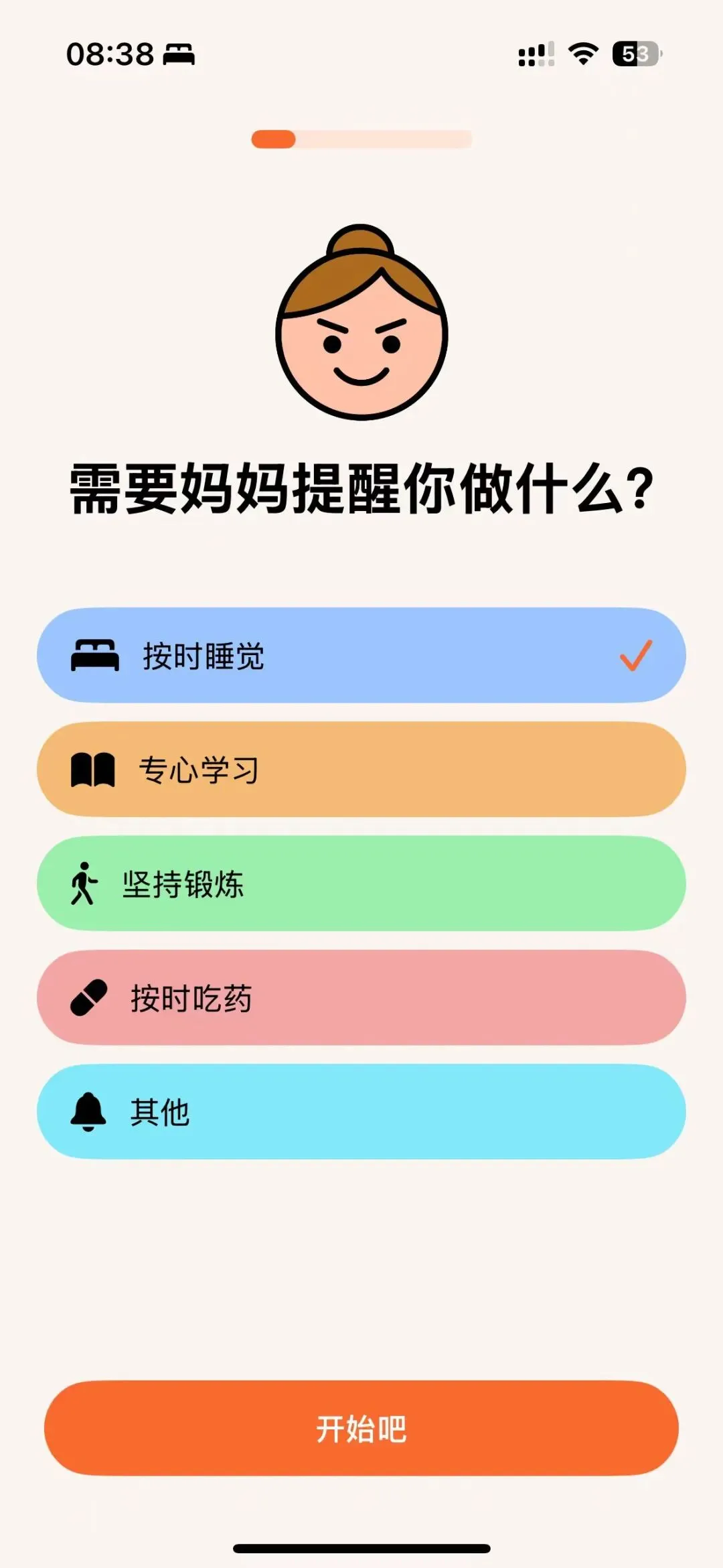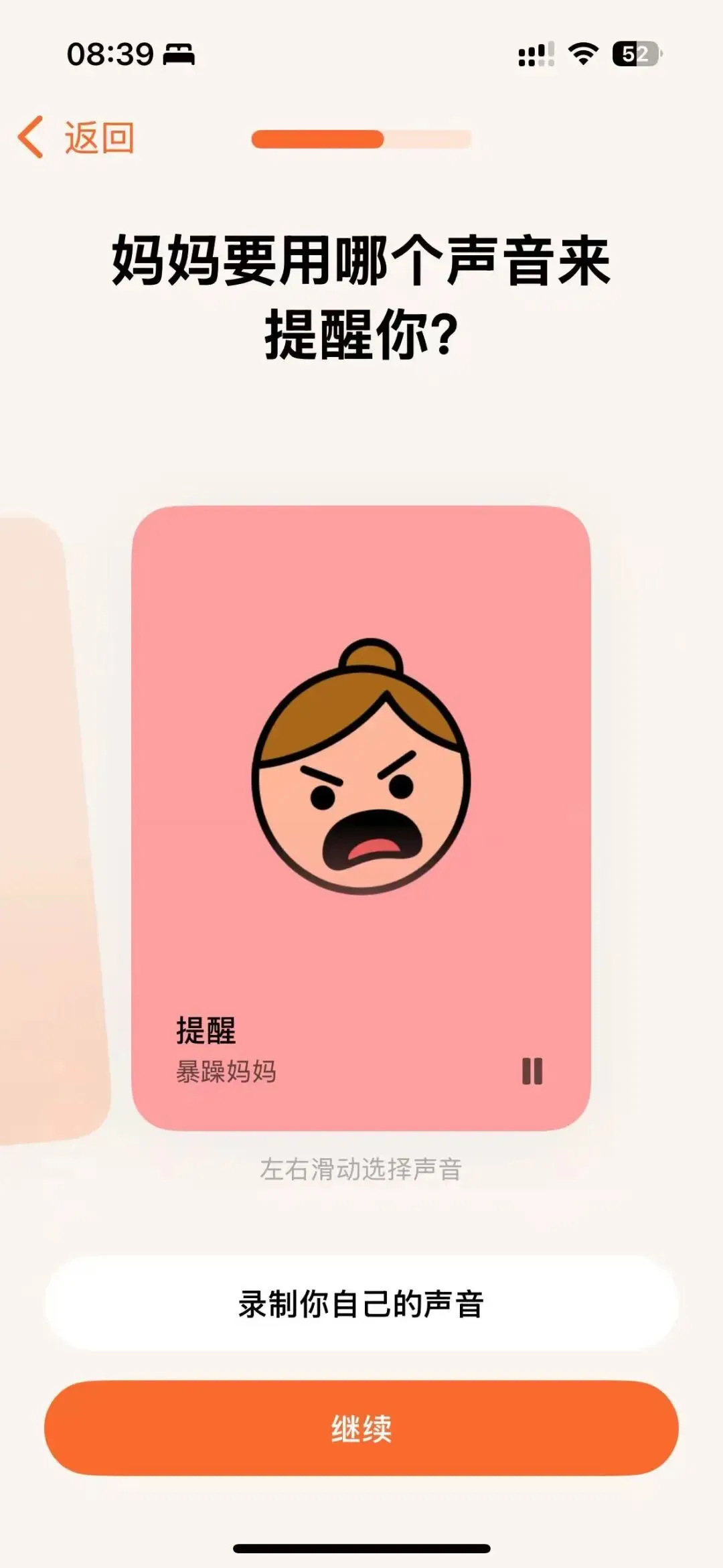 初次进入app会进行一些基础设置的定制,比如:你希望妈妈在哪些事上督促你?你的妈妈会是什么声音?