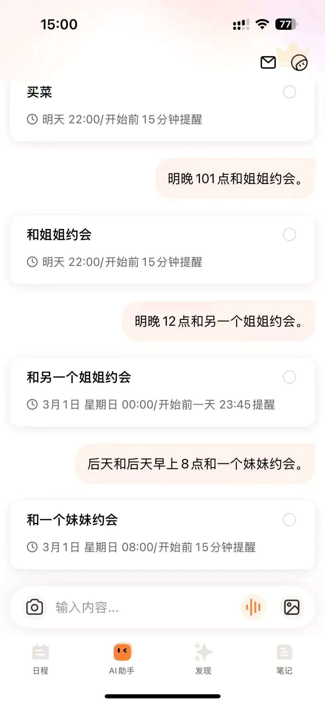 同样是日程管理工具,和妈妈闹钟的区别是,smoreai解决问题的思路不同,它引入了agent的能力,你动动嘴就可以让ai帮你自动帮你新建日程,并按时提醒你,非常高效。