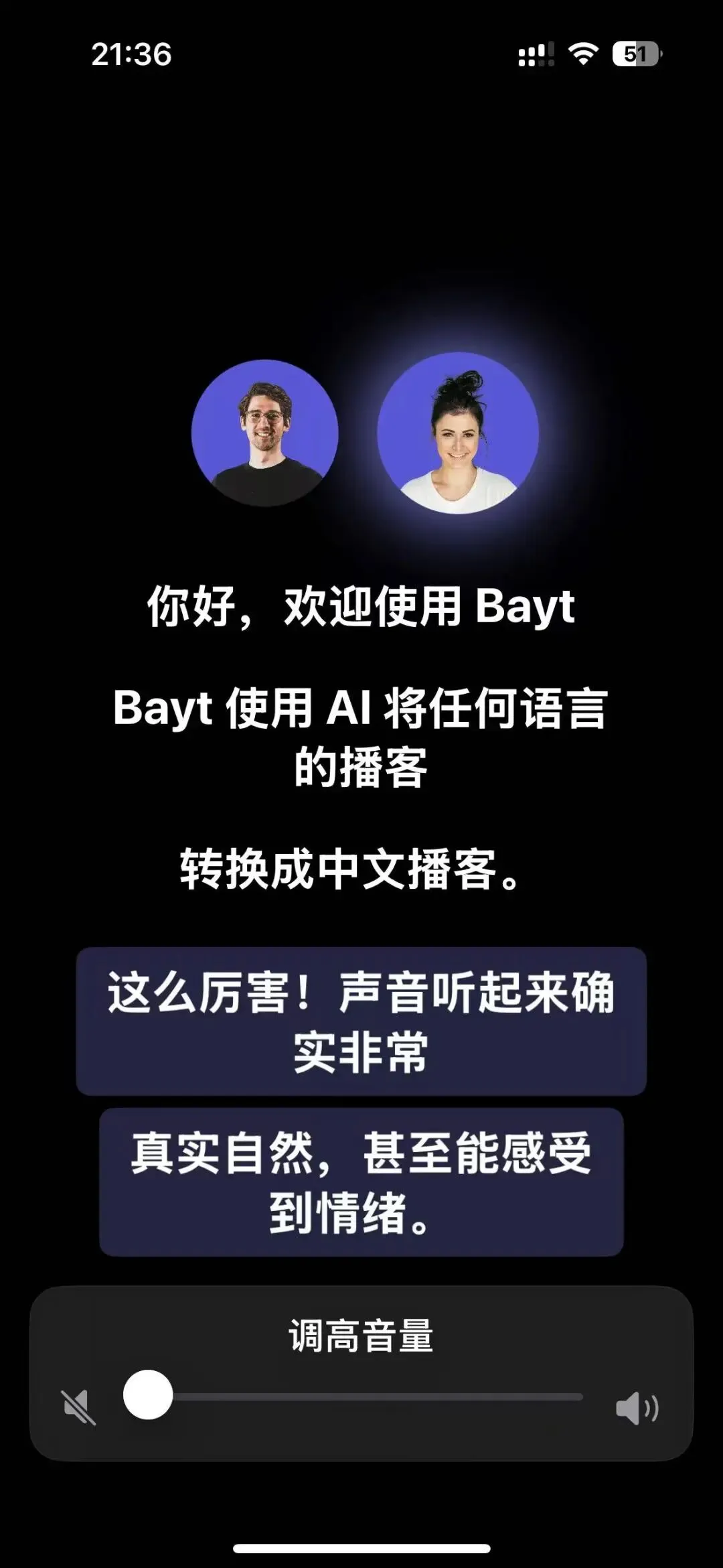 海外大佬的播客因为语言不同听不懂,难受地抓耳挠腮?可以试试Bayt这款产品,它会将任何语言转化成中文,且可以采用对白的形式。