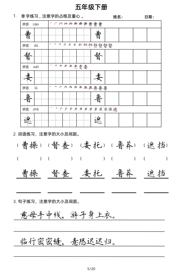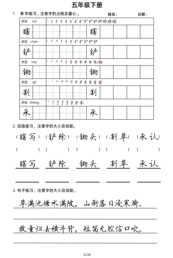 大家好,今天欣妈给大家分享的是:2026年春五年级下册语文《字词句每日小练笔》字帖,有生字练习,词语练习,句子练习;一二三四五六年级同款,电子版可下载可打印,拉至文末左下角,阅读原文处,完整电子版文章末尾可直接领取,无套路,欢迎收藏和下载。如果觉得这份资料不错,建议分享到班级群/年级群,让其他家长打印出来,帮助孩子学习;如果觉得合适,请支持正版!