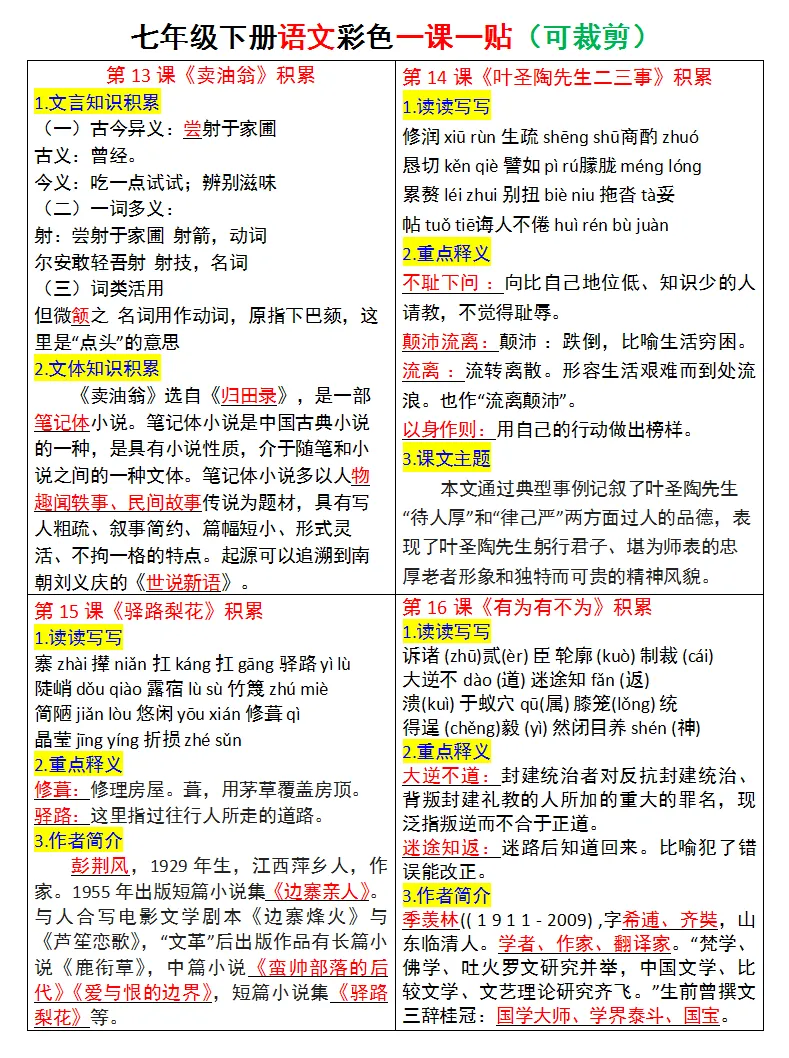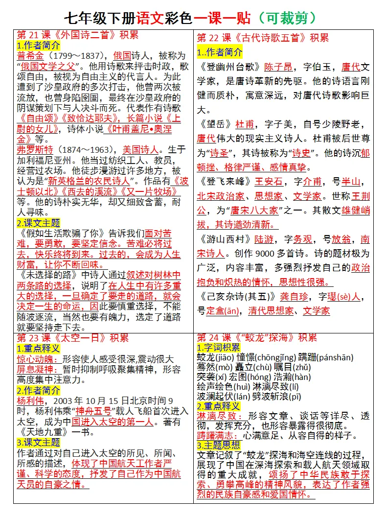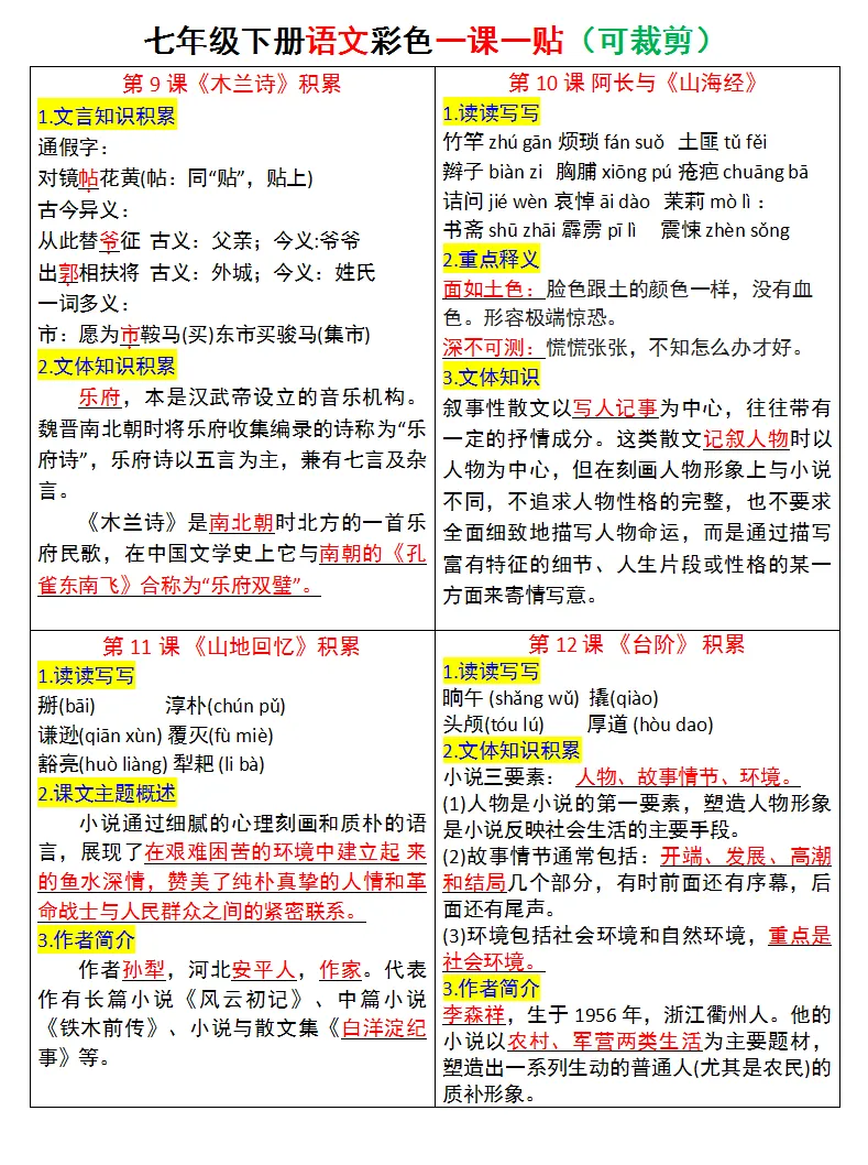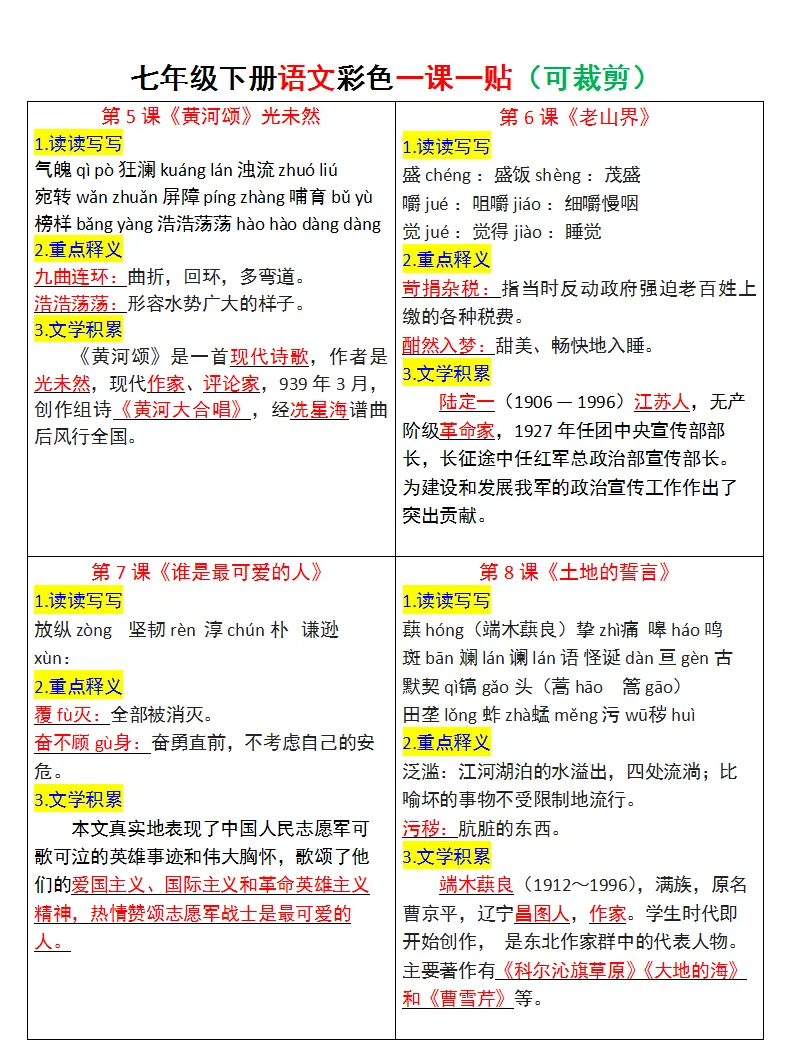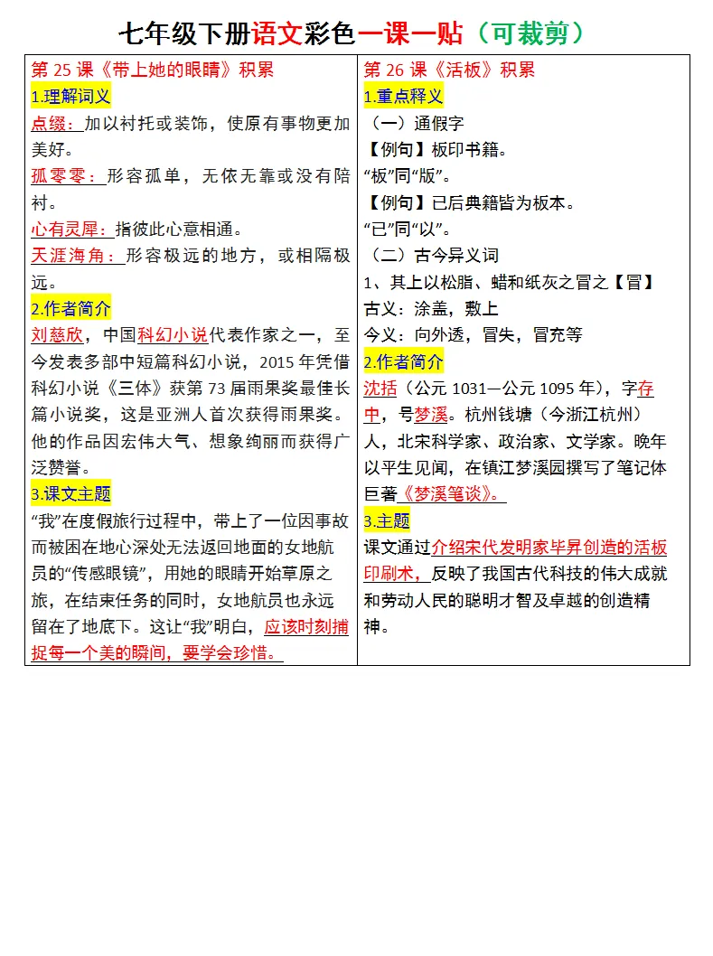 🌸今天给家长分享的是26春人教部编版七年级下册语文《课课贴》彩色版 可剪裁 高清电子版可打印。