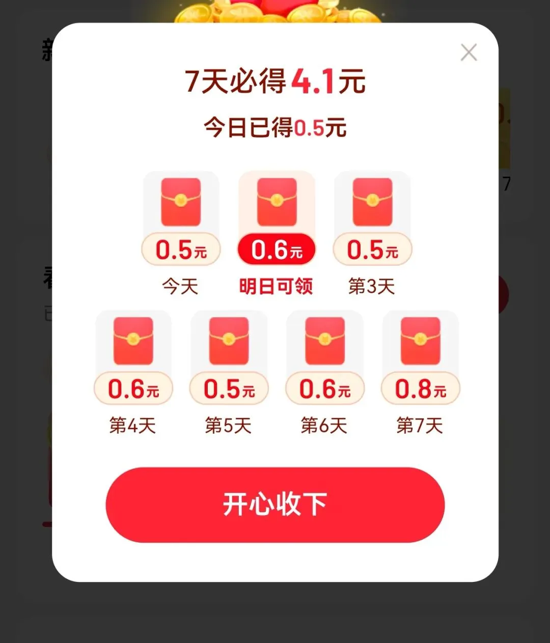 加起来整整4.1元,而且每天只要点一下签到,不用做其他任务,太香了!就算你忘了几天,前面领的也不会清零,这点真的很良心。