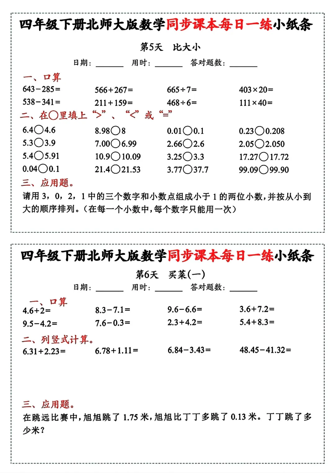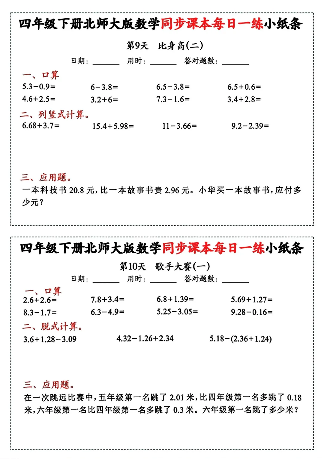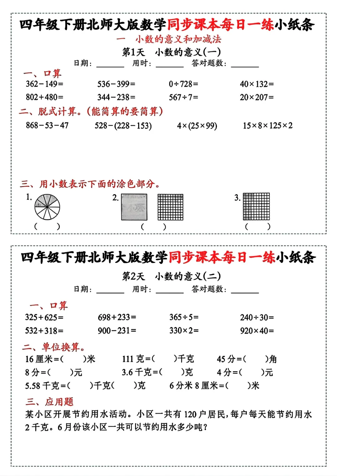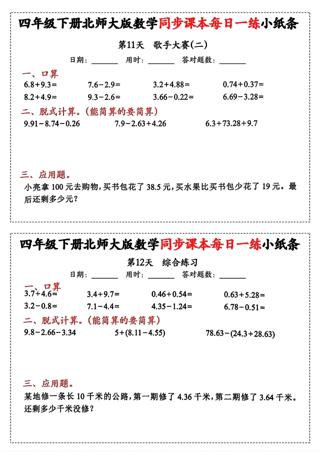 【四年级下册数学北师版】同步课本每日一练小纸条丨完整高清可打印