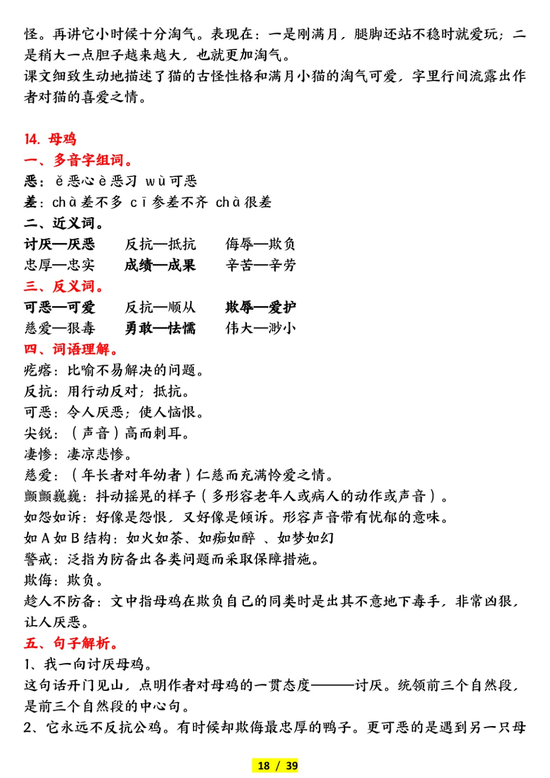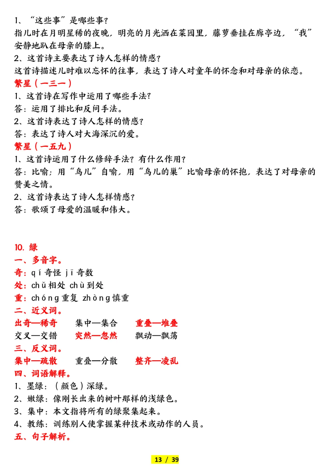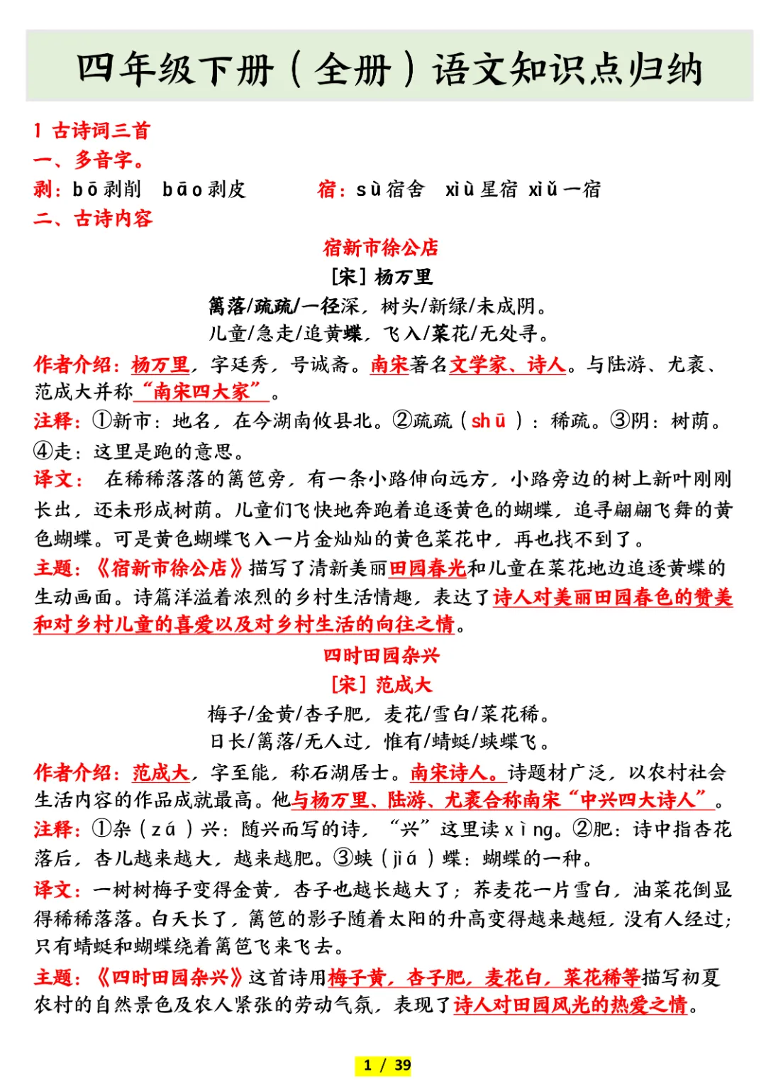 今天给大家分享的是:【四年级下册语文部编版】全册语文知识点归纳丨完整高清电子版可打印