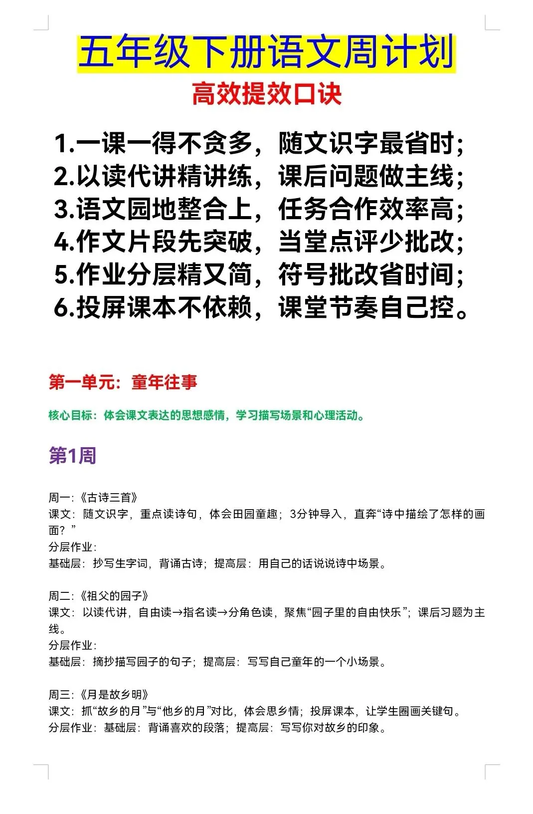 史上最短学期·五年级下册语文周计划模板(可直接打印,适配课时压缩,高效落地)