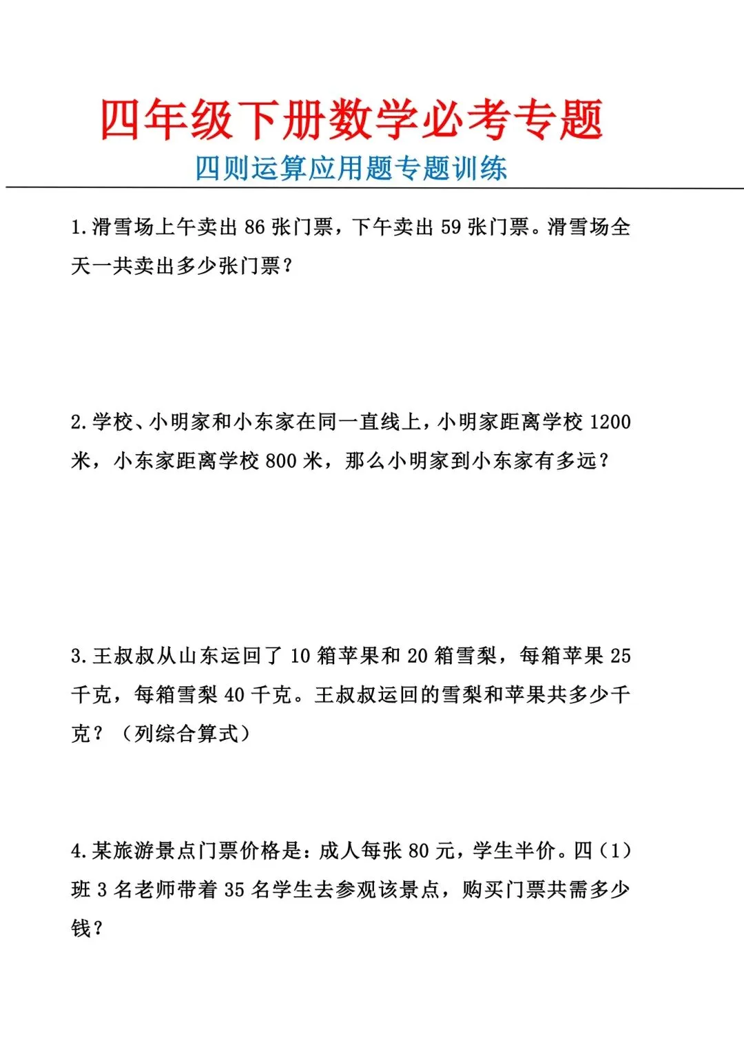四年级下册通用版数学《必考专题|四则运算应用题专题训练》,电子版可下载可打印。这份资料攻克四则运算应用题难点!精选必考题型专练,帮助孩子理清解题思路,掌握核心考点,巩固基础,提升逻辑思维,考试不丢分。需要的朋友抓紧领取,让孩子用起来吧💪!