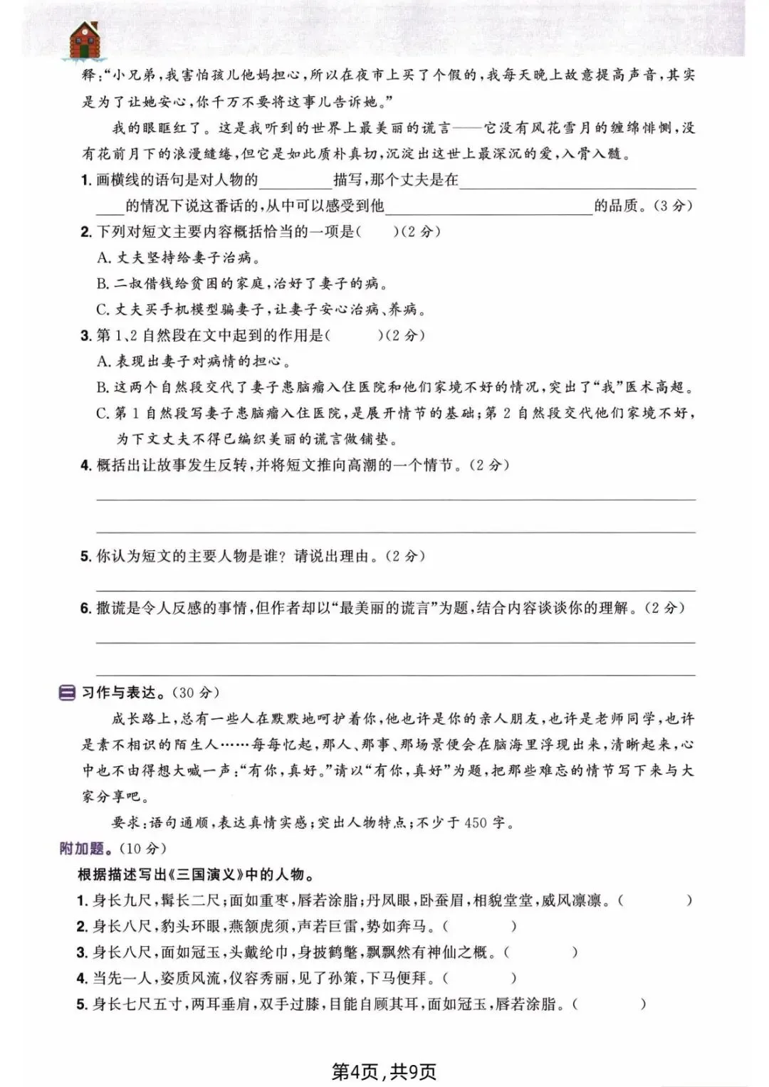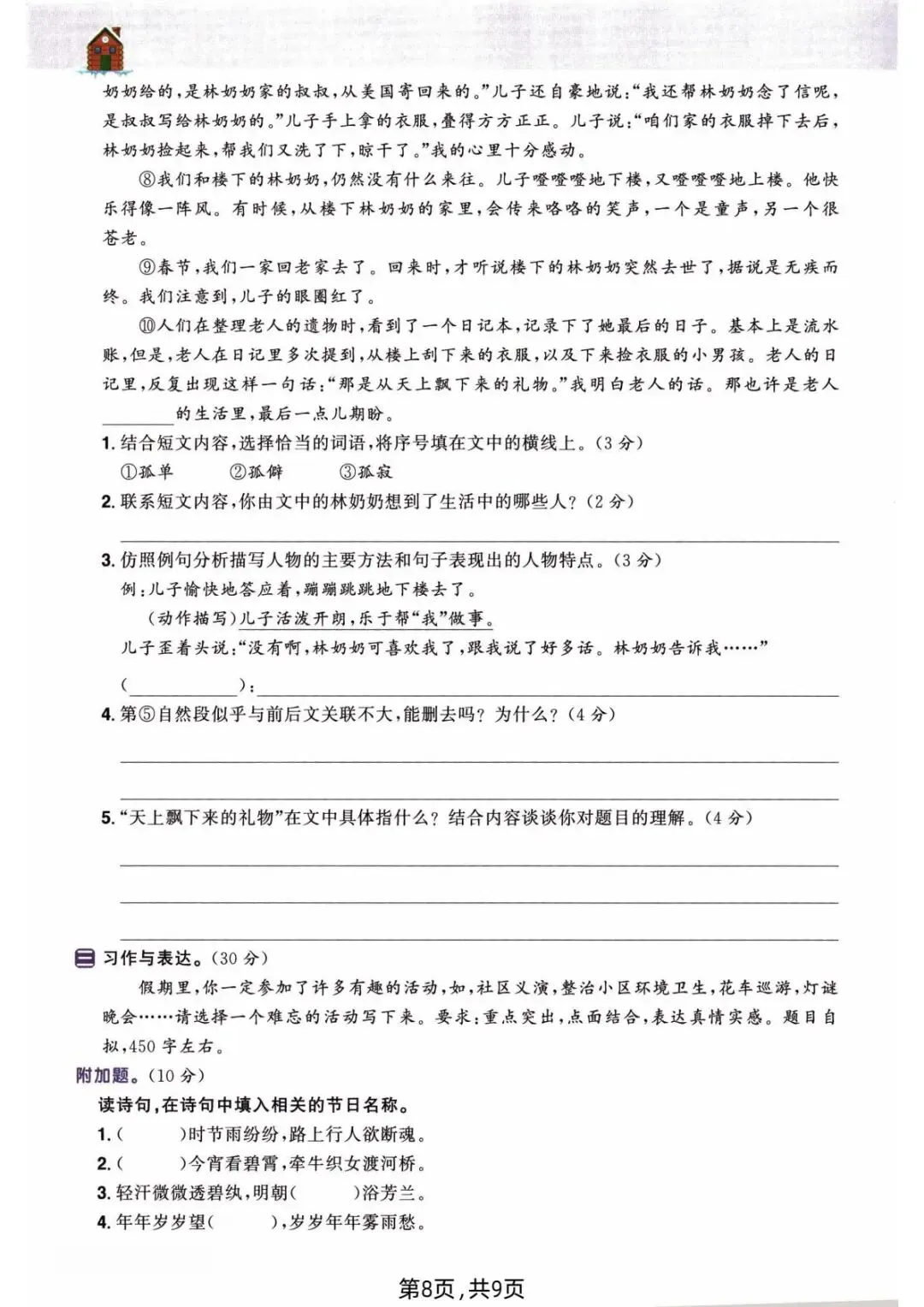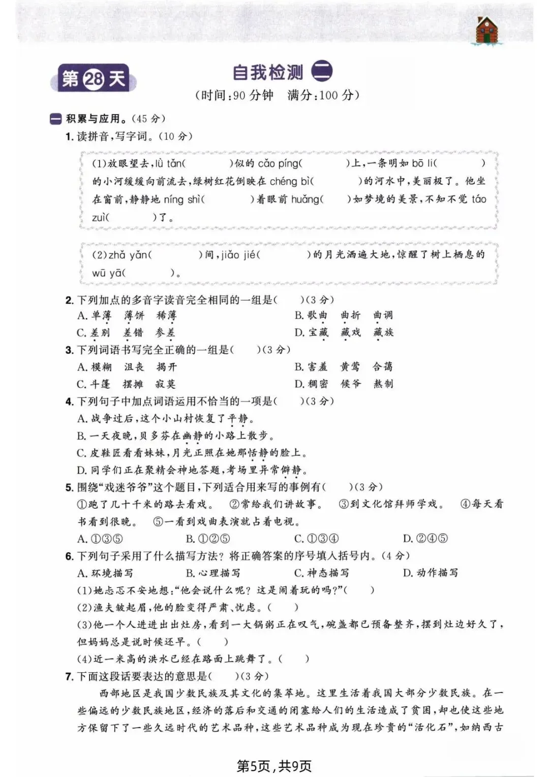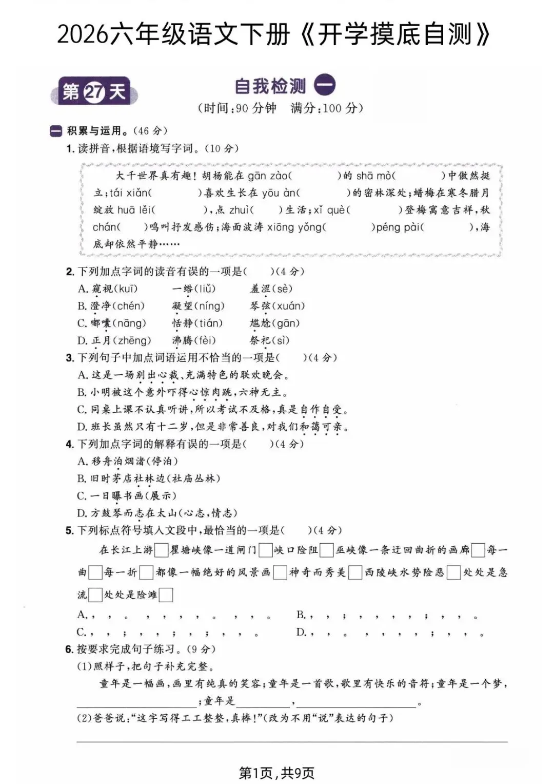 2026年春人教部编版六年级下册语文《开学摸底自测》,含答案,电子版可下载打印。该六年级语文开学摸底自测包括看拼音写字词、句子练习、按课文内容填空等内容,有需要的老师家长快给孩子们打印练习吧。