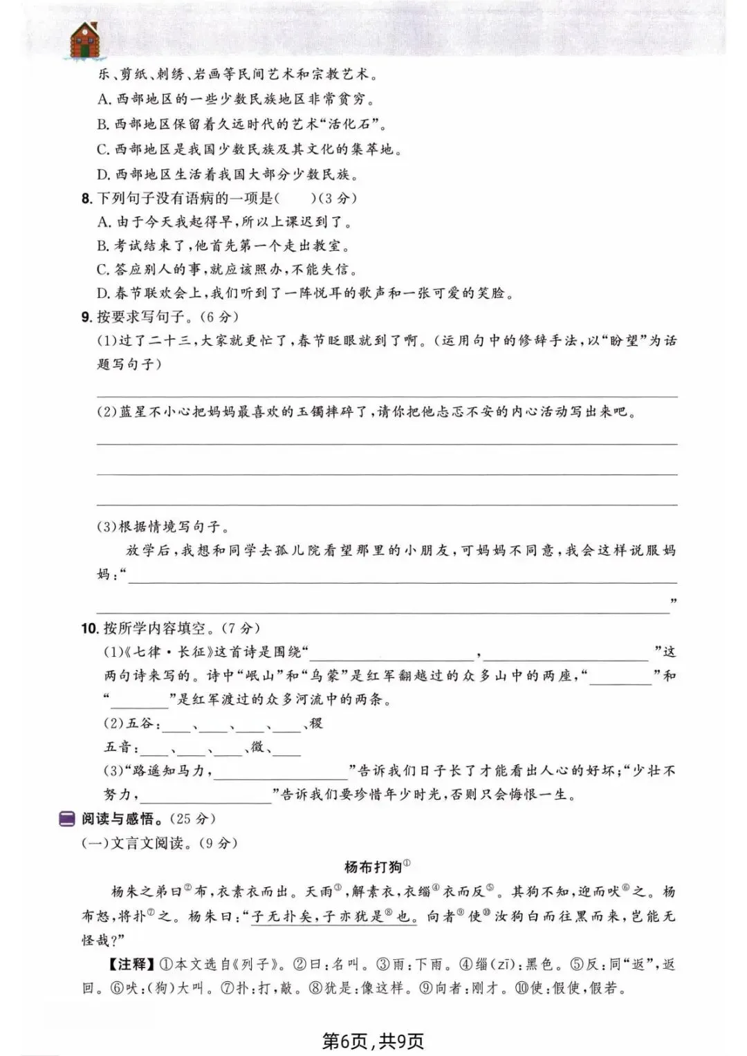 2026年春人教部编版六年级下册语文《开学摸底自测》,含答案,可下载打印